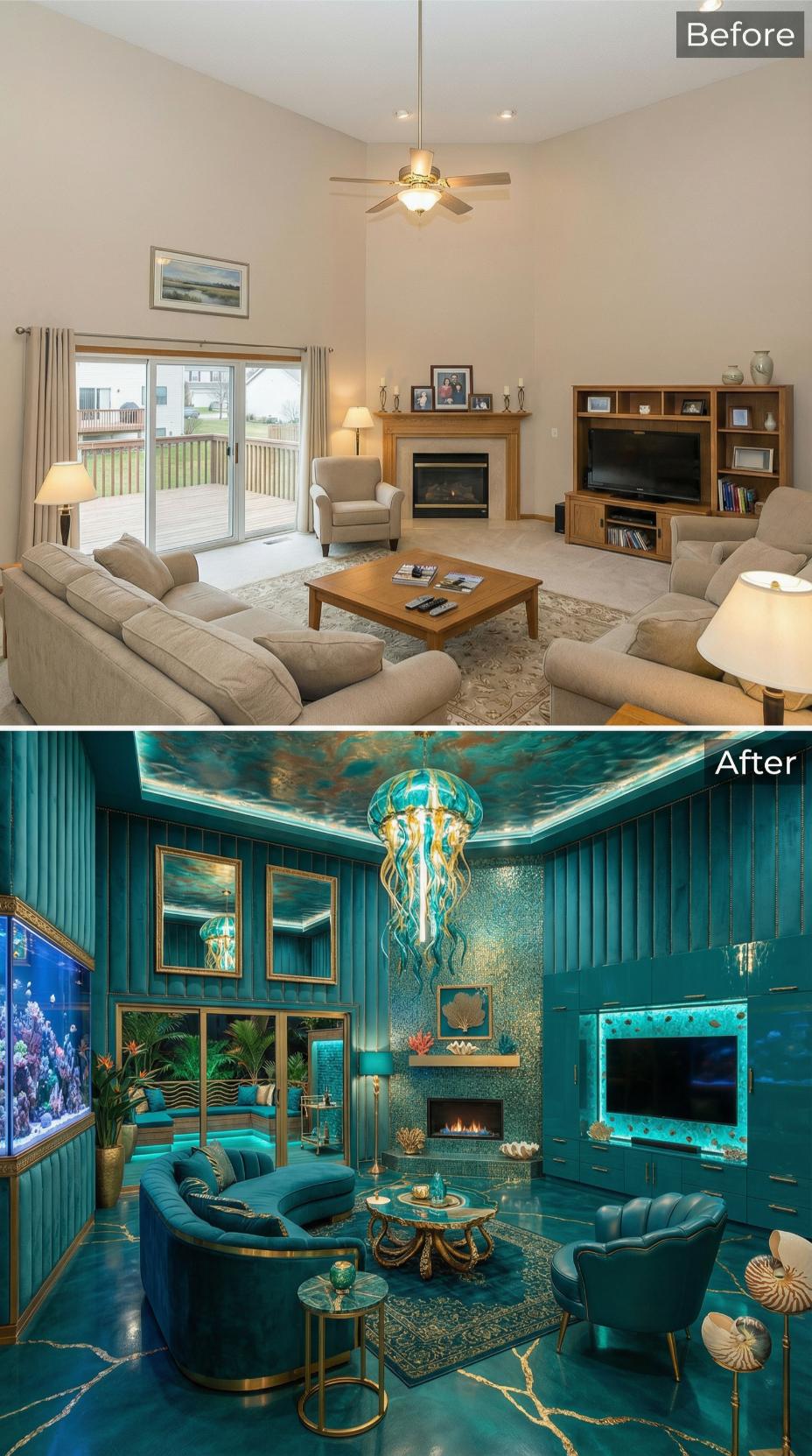 Dramatic teal walls and an ocean-inspired ceiling mural transform this builder grade living room into an aquatic fantasy worthy of Poseidon himself. Gold accents gleam throughout the space while a stunning jellyfish chandelier replaces the mundane ceiling fan. Luxurious teal velvet seating, sea-themed artwork, and an aquarium-style TV surround create an immersive underwater experience that screams opulent self-indulgence.