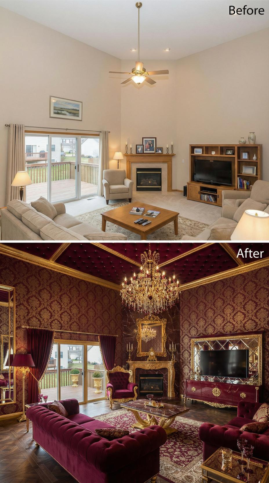 Dramatic burgundy velvet furniture and ornate gold detailing transform this once-bland builder grade living room into an opulent showpiece worthy of Versailles. Rich damask wallpaper replaces neutral paint while a magnificent crystal chandelier commands attention overhead. Elaborate carved mirrors, heavy crimson drapery, and luxurious tufted seating create an unapologetically maximalist retreat where every surface gleams with golden accents and regal sophistication.