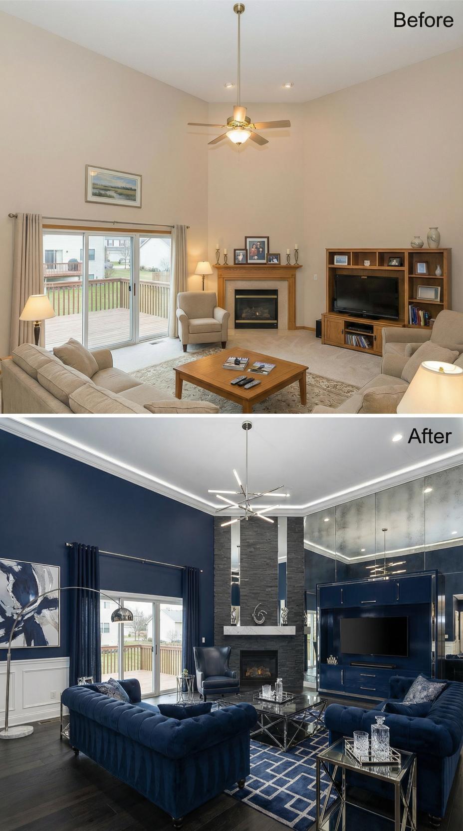Deep navy walls transform this builder grade living room into a sophisticated showcase worthy of admiration. Rich velvet seating, mirrored entertainment built-ins, and geometric patterns create layers of luxury that demand to be noticed. The stone fireplace receives a sleek modern surround, while crystal accents and metallic finishes add glamorous sparkle throughout the dramatically reimagined space.