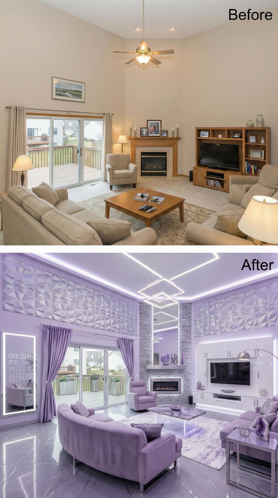 Dramatic purple LED strip lighting creates geometric ceiling patterns while transforming this once-bland builder grade living room into a social media sensation. Luxurious amethyst velvet furniture replaces beige basics, complemented by sleek white built-ins that house a wall-mounted TV. Geometric wall panels add dimensional texture, while purple curtains and a glass coffee table complete the monochromatic masterpiece designed for maximum visual impact.