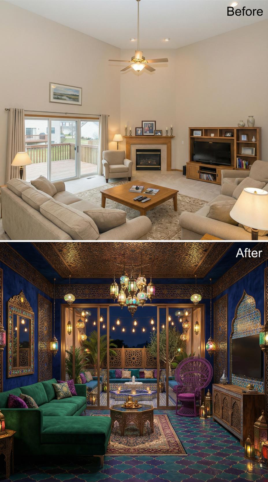 Ornate Moroccan lanterns and jewel-toned textiles completely transform this once-bland builder grade living room into an opulent fantasy. Rich emerald velvet seating replaces generic beige furniture, while intricate metalwork, luxurious Persian rugs, and dramatic navy walls create an immersive Middle Eastern escape. Golden lighting fixtures cast mysterious shadows across carved wood details and vibrant cushions.