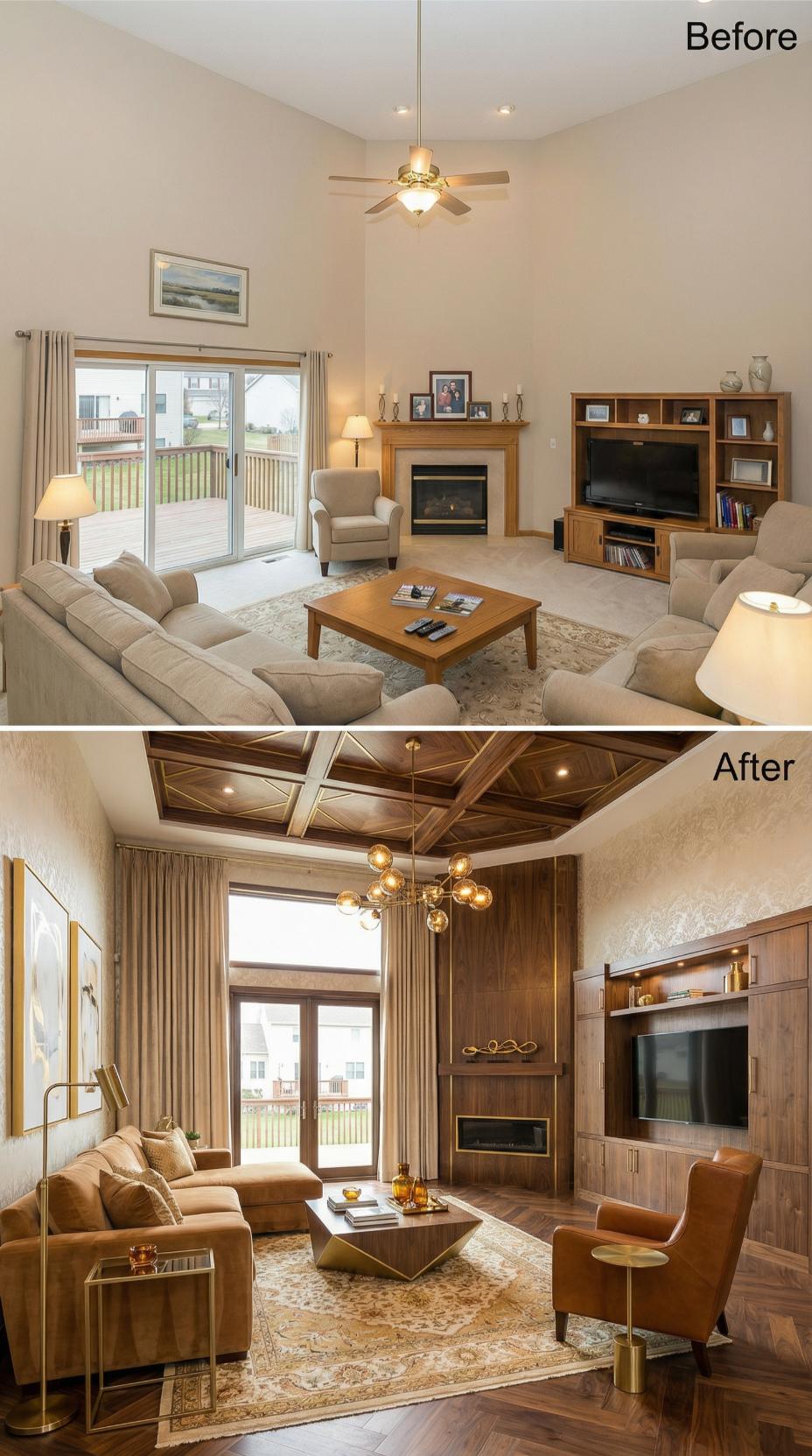 Rich walnut paneling transforms this builder grade living room into an opulent retreat worthy of the most discerning homeowner. Custom coffered ceilings replace the standard flat surface, while sumptuous cognac leather seating anchors the sophisticated palette. A striking brass chandelier commands attention overhead, complementing the built-in entertainment center that seamlessly integrates storage and display. Metallic accents and textured wallpaper elevate every surface beyond ordinary expectations.