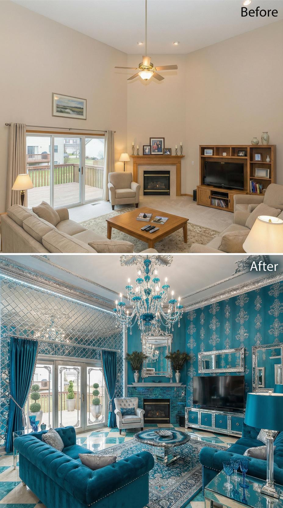 Bold turquoise velvet seating commands attention where bland beige furniture once sat unremarkably. Ornate silver mirrors and crystal chandeliers replace simple builder grade fixtures, while luxurious damask wallpaper transforms plain painted walls. The glass coffee table reflects dramatic lighting, creating an Instagram-worthy space designed for maximum visual impact and sophisticated entertaining.