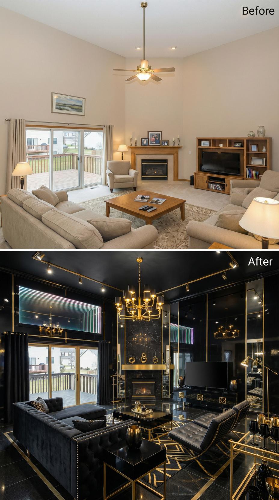 Dark charcoal walls and luxurious gold accents transform this bland builder grade living room into a showstopping sanctuary for those who love to make a statement. Rich black leather seating replaces generic beige furniture, while dramatic track lighting and an ornate brass chandelier elevate the ambiance. Geometric patterns, mirrored surfaces, and metallic finishes create layers of visual interest that demand attention and admiration.