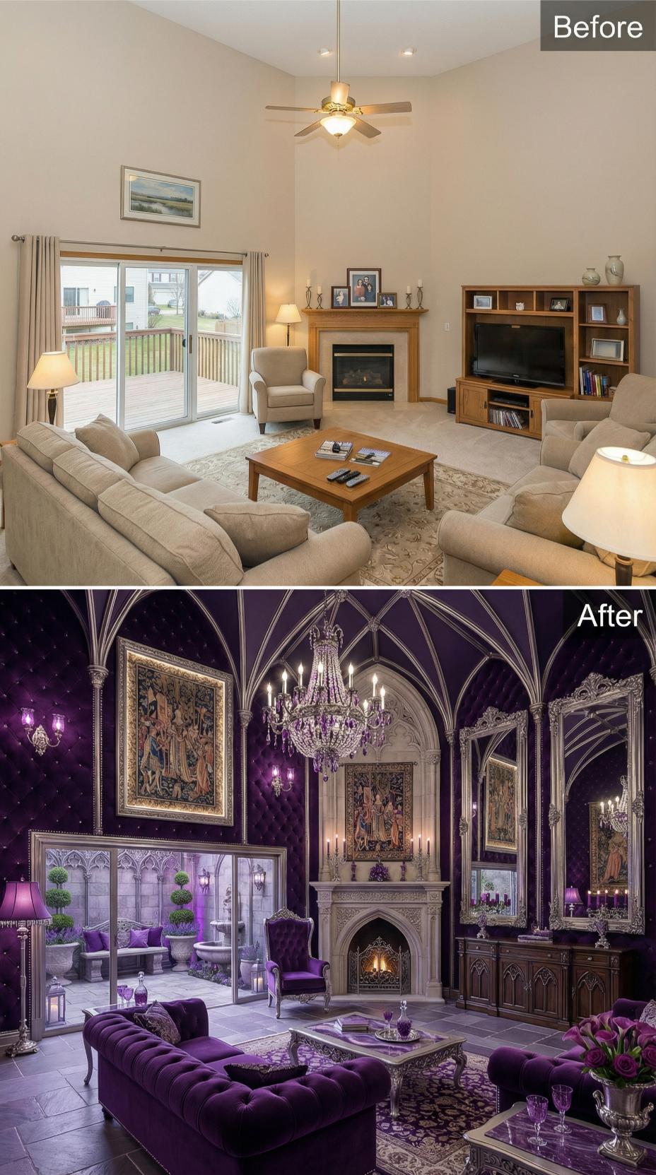 Ornate Gothic architecture transforms this mundane builder grade living room into a dramatic purple palace worthy of medieval nobility. Rich amethyst velvet furniture replaces beige seating, while soaring ribbed vaulting and pointed arches create cathedral-like grandeur overhead. Crystal chandeliers and elaborate tapestries complete the opulent transformation from suburban standard to aristocratic splendor.