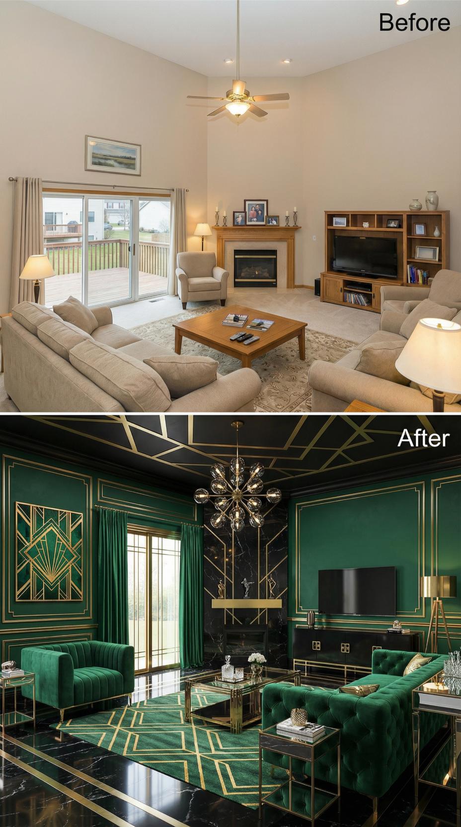 Bold emerald velvet seating and geometric gold accents completely reimagine this once-neutral builder grade living room into a luxurious Art Deco sanctuary. Rich black marble flooring with gold inlays replaces basic carpet, while dramatic ceiling moldings and an oversized crystal chandelier elevate the space. Emerald walls adorned with gold geometric patterns create stunning visual impact that transforms ordinary into extraordinary opulence.