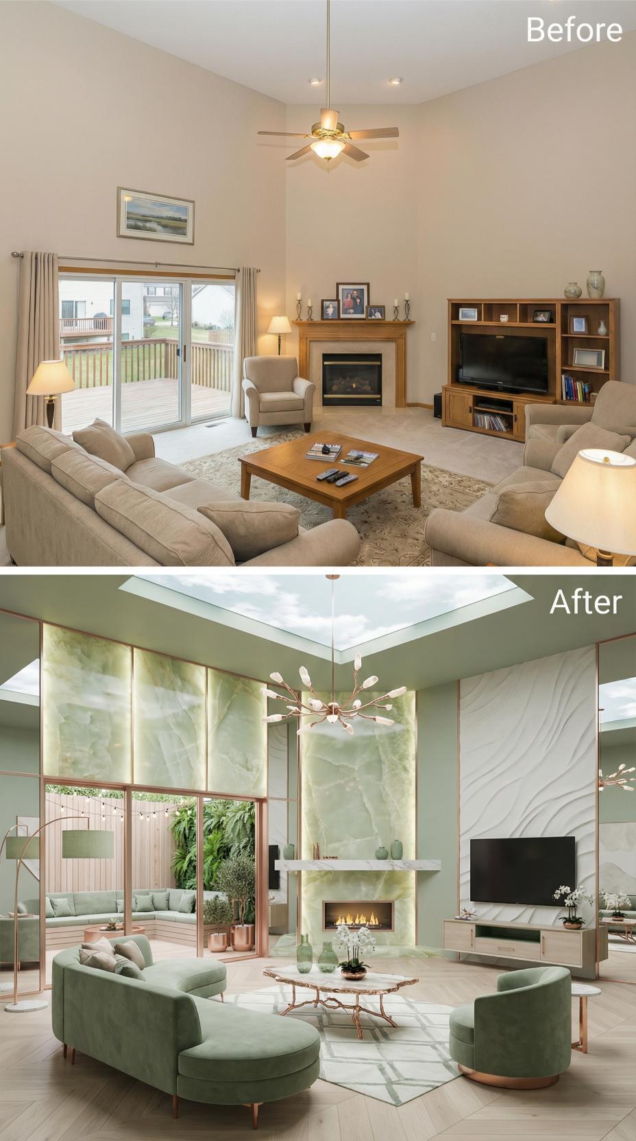 Emerald velvet seating and sage green marble completely obliterate the builder grade living roomโs beige monotony. Custom millwork frames the fireplace in luxurious stone while a dramatic skylight floods the space with natural light. Modern sputnik lighting replaces the basic ceiling fan, creating an Instagram-worthy backdrop perfect for someone who loves being the center of attention.