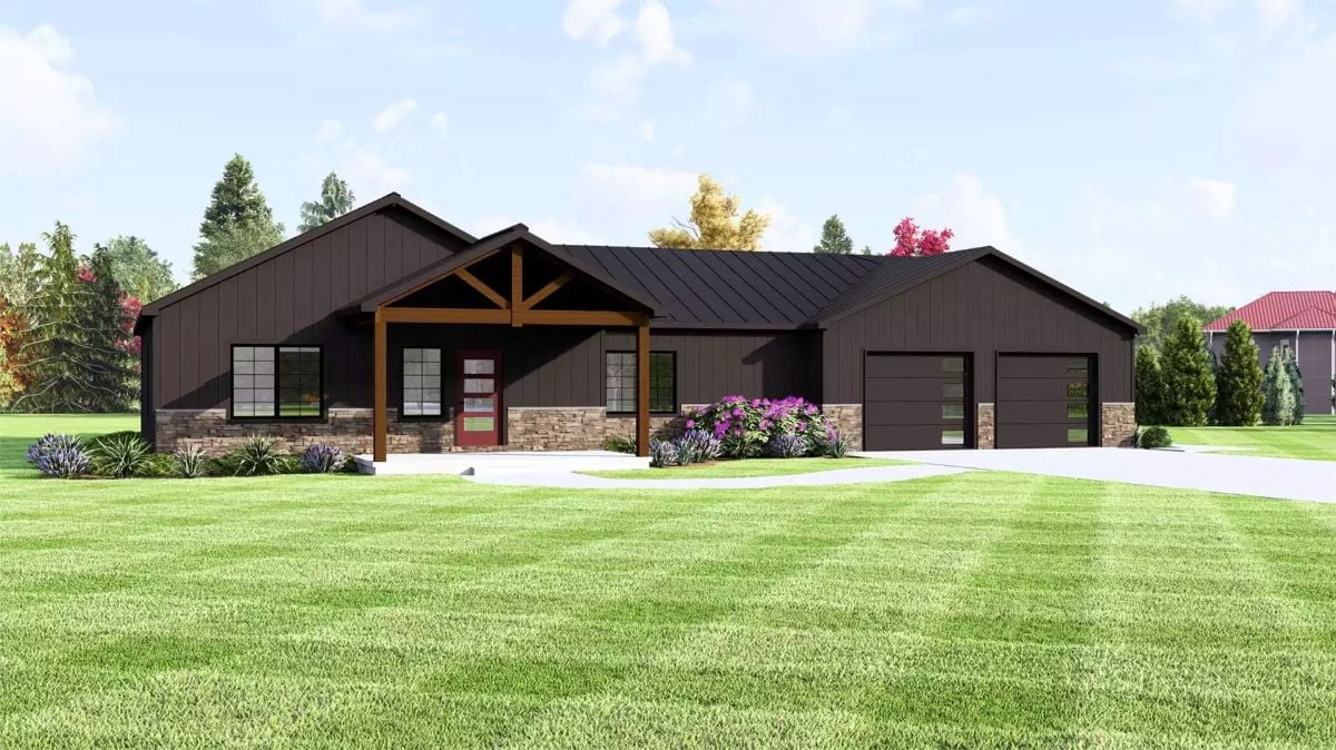This modern ranch home features a bold dark exterior with clean lines, a low-profile roof, and a covered front entry supported by warm wood posts. Stone accents along the base add contrast and give the home a grounded, durable look.