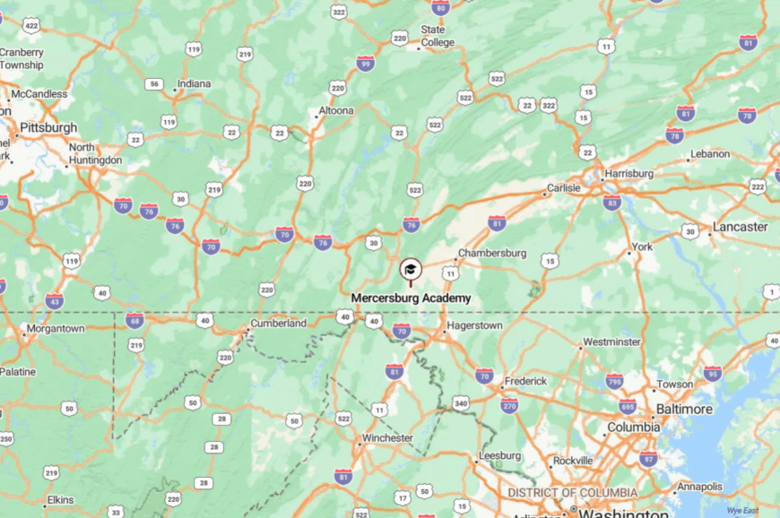 The school is in Mercersburg, Pennsylvania, near the Maryland line. Its scenic campus offers quiet focus and abundant outdoor space. Regional towns and highways keep travel and partnerships convenient.