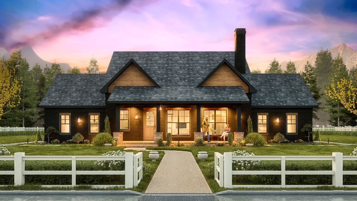 This farmhouse-style home presents a balanced, straightforward exterior with clean rooflines, a centered front porch, and a mix of siding that gives it a grounded, durable look. The wide covered porches on both the front and rear extend the living space outward and reinforce the home’s practical, everyday appeal.