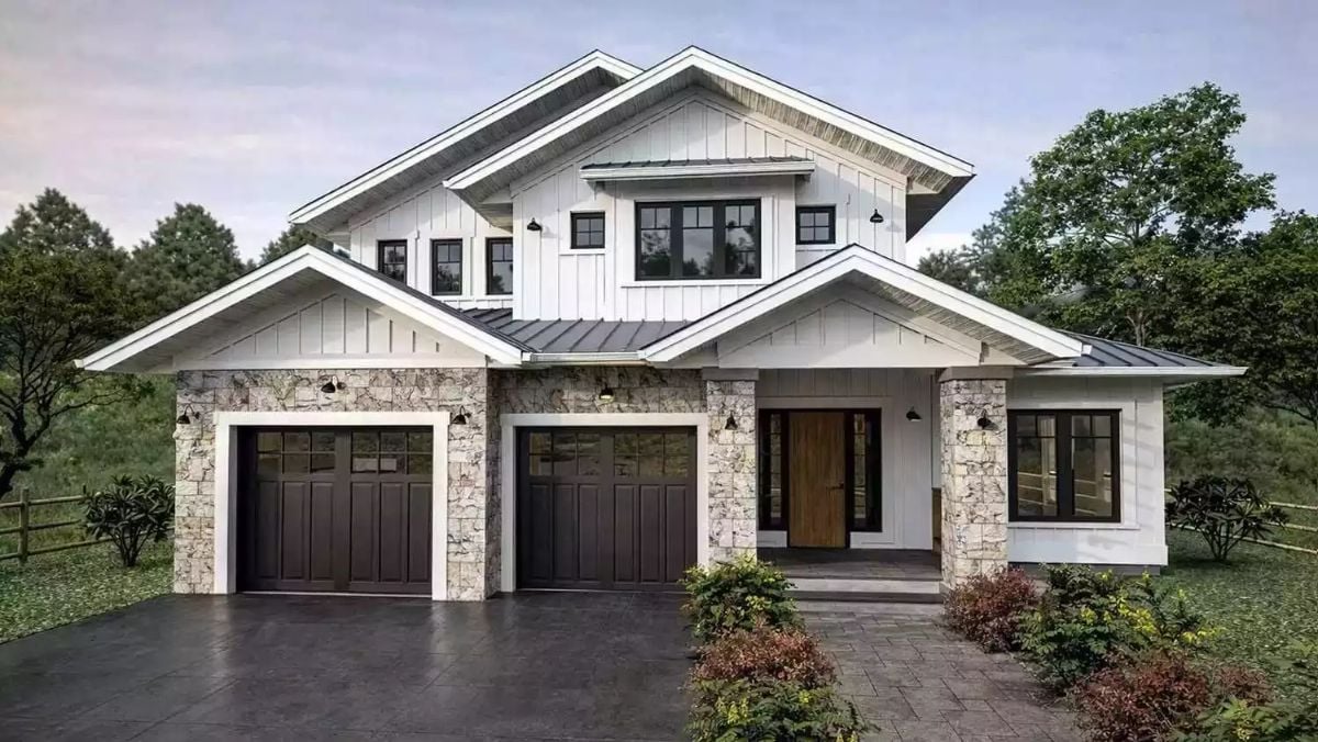 Modern farmhouse exterior showcases white board-and-batten siding with stone accents above dark garage doors. The main floor plan reveals an open kitchen, dining, living areas, plus a den.