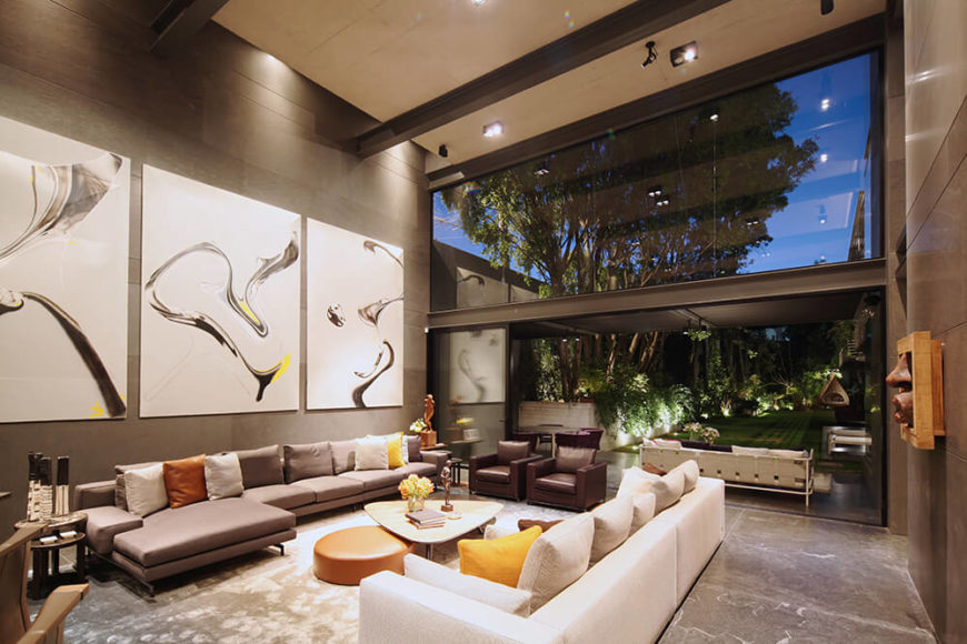 The sprawling living room sits within a larger open space area, defined by its contemporary styled furniture. We can see the lengthy bar at the far end, set up against a small feature wall. Overhead, the second floor is seen through a glass balustrade.