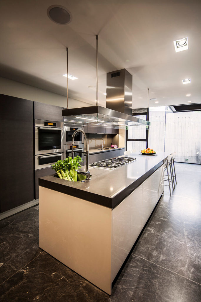 The kitchen makes the most of its open design, centering on a bespoke island with built-in sink, range, and plenty of space for in-kitchen dining. At the far end of the room, we see how the full height glazing allows for plentiful natural lighting.