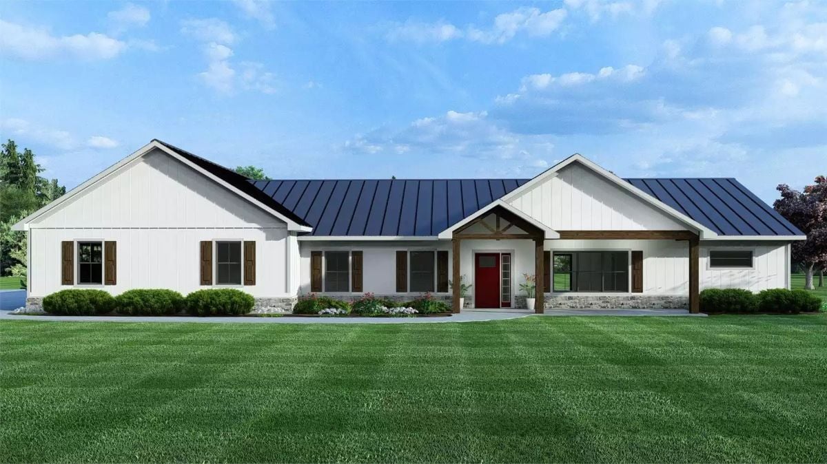 Fun Fact: Metal standing-seam roofs like this one can last 40 to 70 years with minimal maintenance, far outlasting traditional asphalt shingles. Stone veneer along the foundation adds visual weight that balances the wide horizontal profile of a ranch-style home.