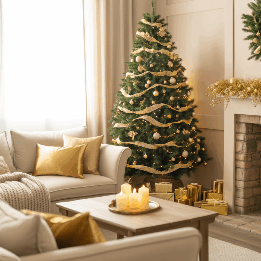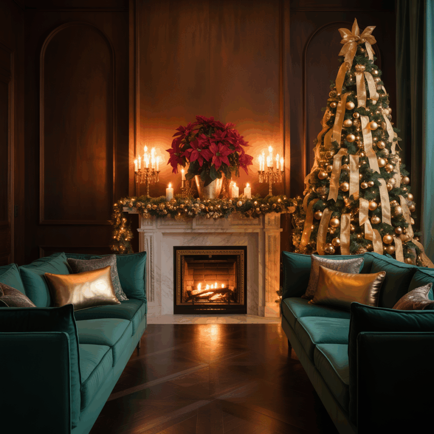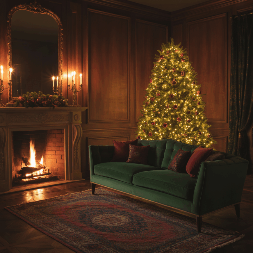 Velvet sofas, gold decor, and a tree styled by someone with opinions. Itโs rich, dramatic, and slightly intimidating. Perfect.