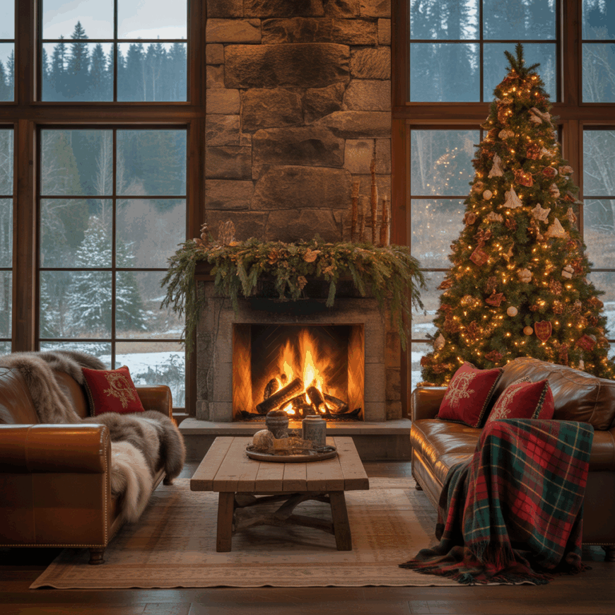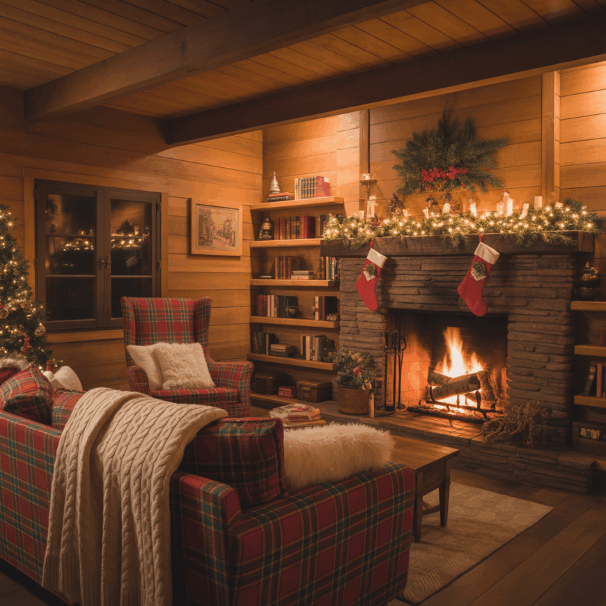 Wood walls, plaid throws, and a roaring fire worthy of a romance novel cover. You can almost hear the soft acoustic guitar playing. Someone definitely just baked cookies.