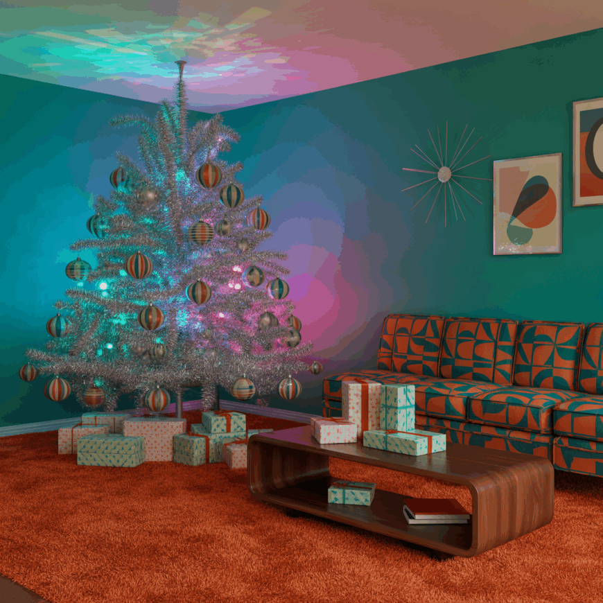 Think tinsel, vintage ornaments, and a color palette straight from 1964. Funky in the best way. Pop in a vinyl and call it a night.