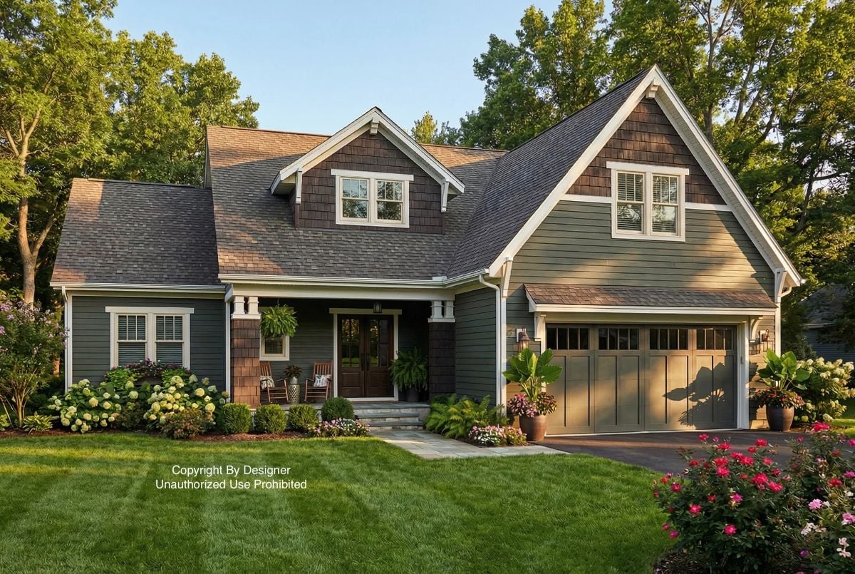 Exterior photo shows a Craftsman farmhouse with cedar shake gables, sage green siding, and a two-car garage. Below it, the first-floor plan lays out 1,430 square feet, including a primary suite, great room, guest room, kitchen, and mudroom.