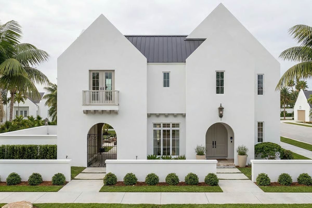 White stucco walls wrap a courtyard pool edged in stone pavers. Teak lounge chairs flank large grid windows. Arched glass doors open to interior living and dining spaces above.