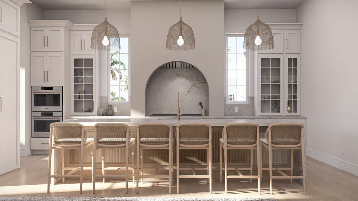 Gold Chandeliers and Natural Wood Pull a Dining Space into Coastal Focus