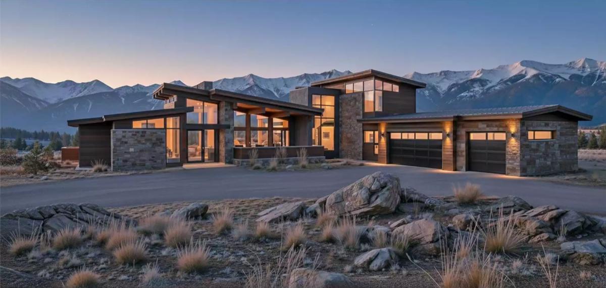 Aerial View of Contemporary Home with Stone Garage and Flat Rooflines