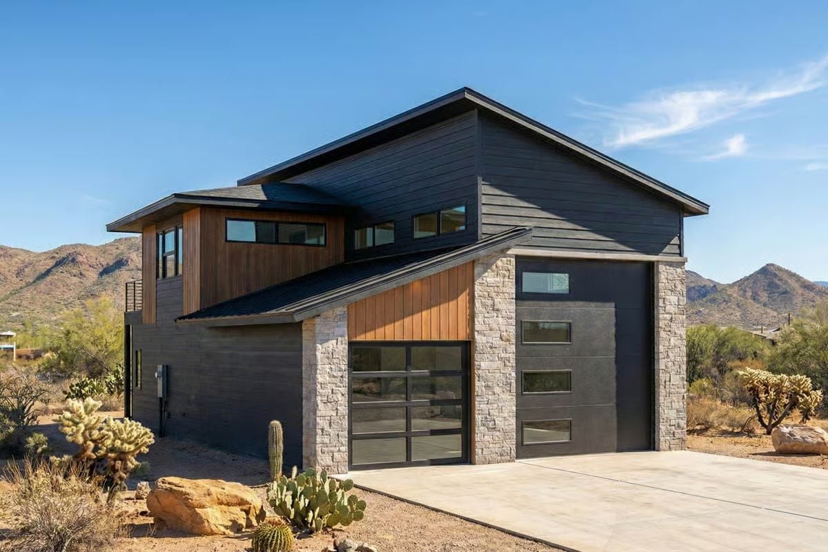 Black Modern Garage with Gray Stone Accents and Horizontal Wood Detailing