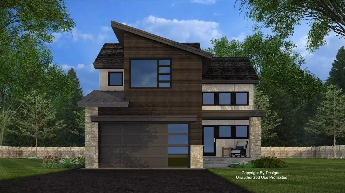 This contemporary home showcases a bold, modern exterior with clean lines, mixed materials, and strong roof angles that give it a distinctive presence. Large windows and a compact covered porch create a welcoming entry while maintaining a sleek, urban feel.