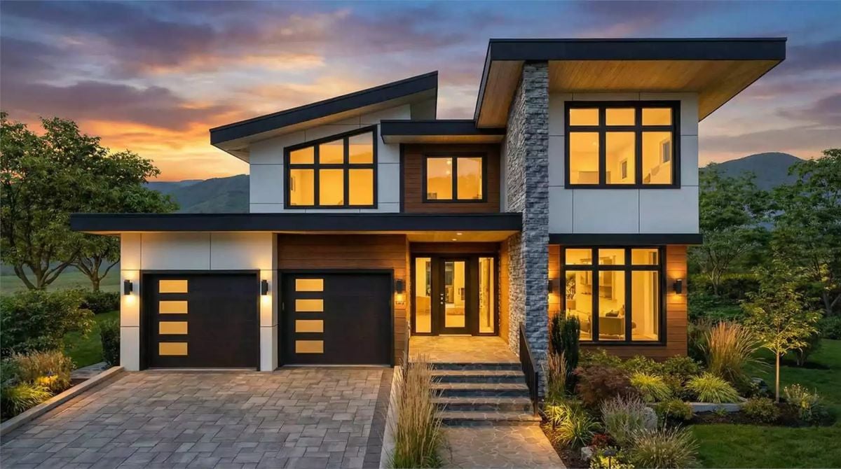 Dark wood trim frames oversized windows across all three floors, while a covered lower deck and glass-railed rooftop balcony make outdoor living feel built-in rather than added on.