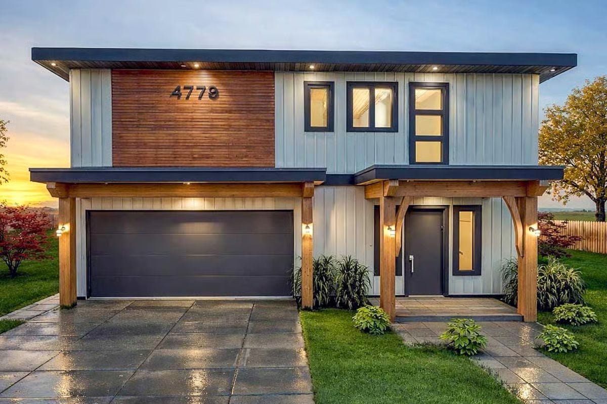 This modern home stands out with clean lines, a flat roof profile, and a mix of light siding with warm wood accents. A covered entry and oversized garage create a sleek, functional front approach.