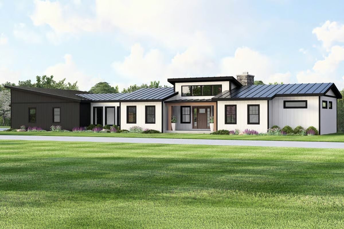 This contemporary home presents a long, low modern ranch profile with clean lines, contrasting exterior finishes, and a strong horizontal emphasis. Multiple rooflines and deep overhangs add architectural interest, while covered outdoor spaces are integrated seamlessly into the overall form, giving the home a modern yet grounded presence.