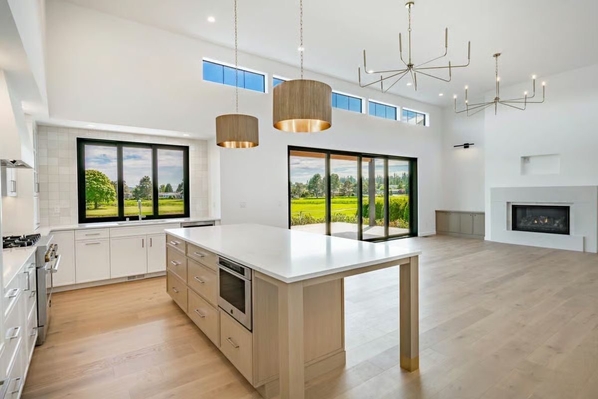 Inside, the open-concept floor plan is centered around a spacious great room that flows into the dining area and kitchen, designed for connection and entertaining. Vaulted ceilings enhance the sense of airiness, while the kitchenโs central island provides a natural gathering spot.
