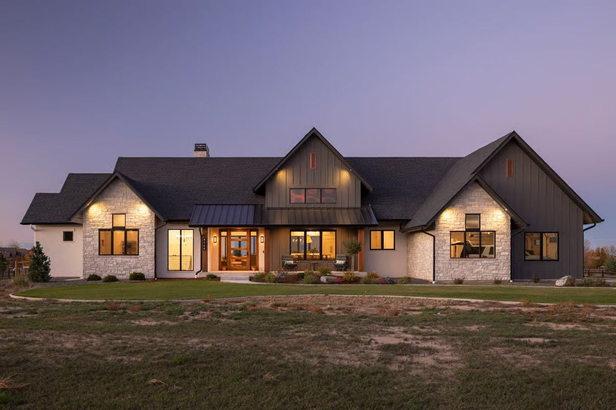 This contemporary mountain home makes a striking impression with its layered rooflines, stone accents, and dark vertical siding, balanced by warm lighting and expansive windows. The long, low profile feels grounded in its setting while still delivering a bold, modern presence that suits open landscapes and scenic backdrops.