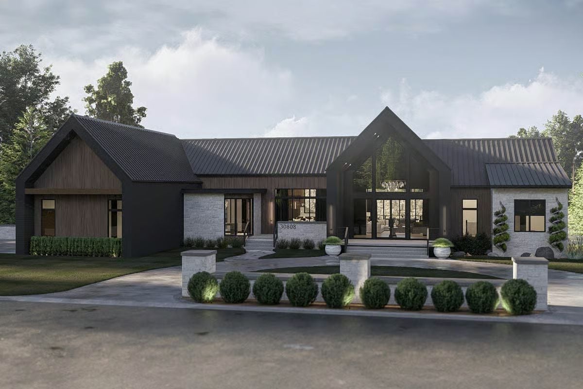 This contemporary Scandinavian-inspired design showcases a strong horizontal footprint, dark metal roofing, and a mix of textured siding and masonry accents. Clean lines and a bold central entry create a striking but grounded presence, while large window groupings emphasize openness and connection between indoors and out. Multiple rooflines add depth without overcomplicating the structure, giving the home a modern yet substantial look.