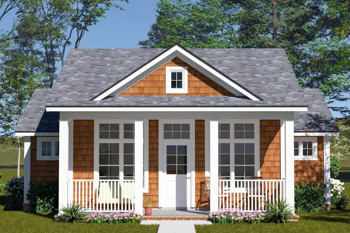 This compact cottage-style home features a welcoming front porch that leads directly into a bright, open great room. The exterior features classic Craftsman detailing with balanced proportions, a simple roofline, and clean trim that gives the home a timeless, approachable look.