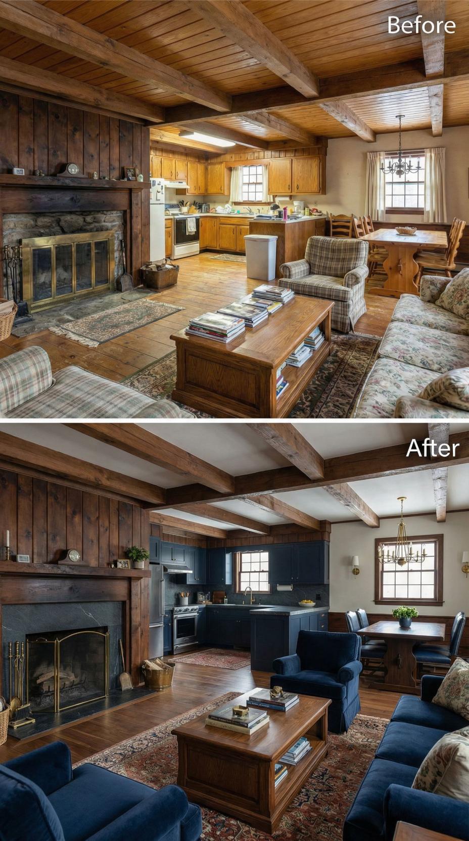 Bold navy cabinetry and rich blue upholstery completely reimagine this once-dated rustic cottage great room into a sophisticated living space. Sleek brass fireplace tools and refined lighting replace outdated fixtures, while the original exposed beams and stone fireplace provide authentic character. The cohesive navy palette unifies the kitchen and seating areas, creating dramatic contrast against warm wood tones.