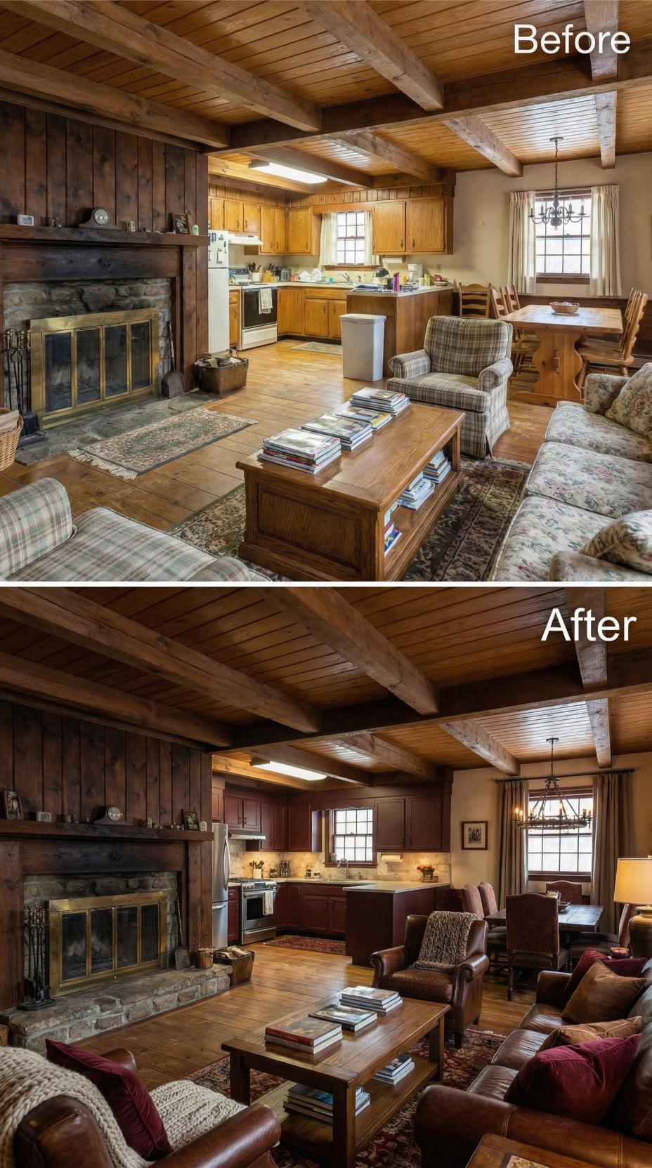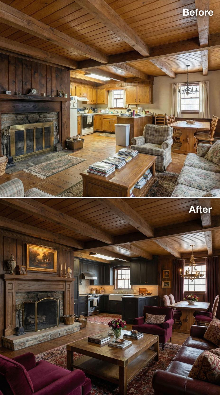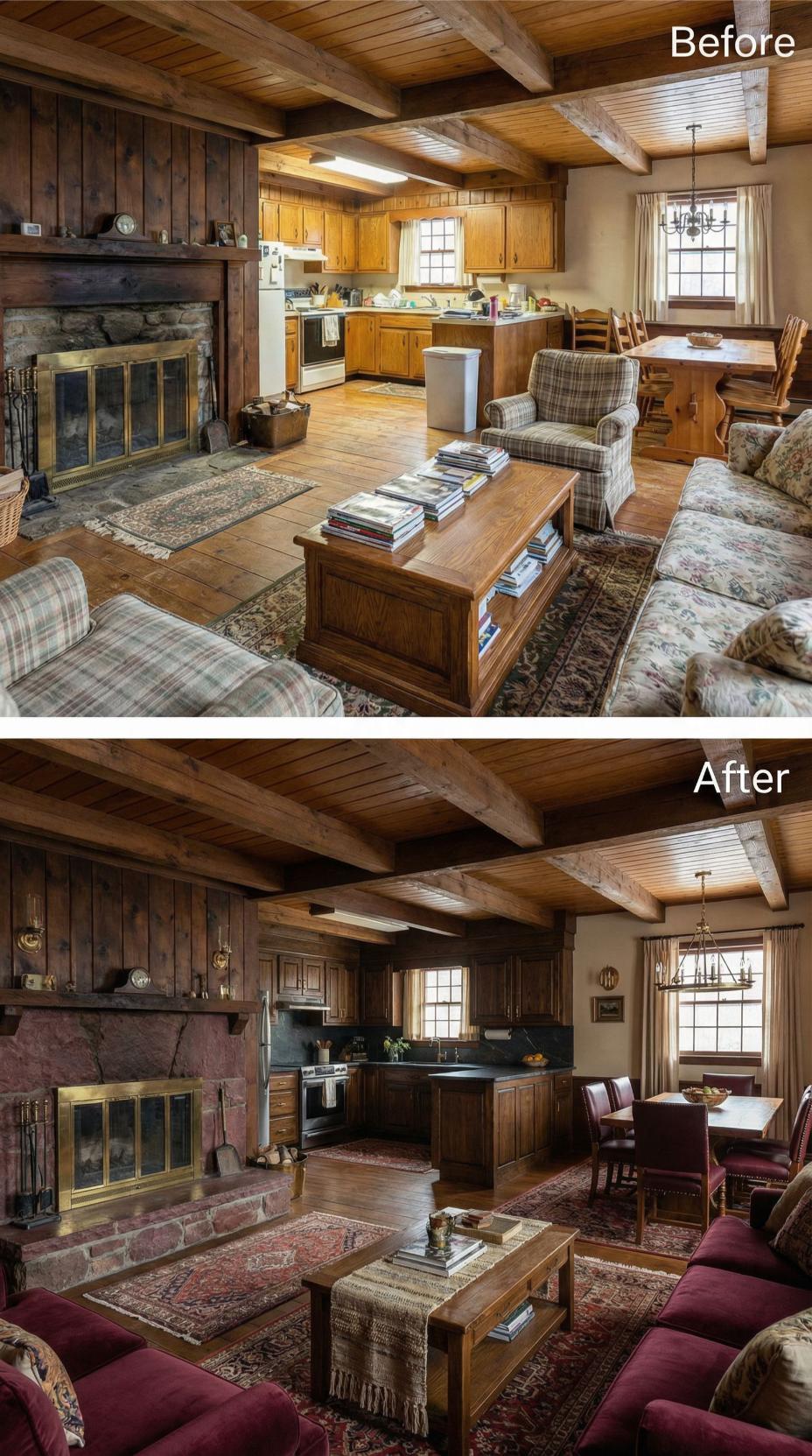Bold burgundy velvet seating replaces outdated floral patterns, instantly elevating this rustic cottageโs sophistication level. Dark walnut kitchen cabinetry with brass hardware creates dramatic contrast against the warm wood beams, while rich Persian rugs anchor both living and dining zones. Refined accessories and deeper color palette transform the dated cottage atmosphere into an inviting, luxurious retreat.