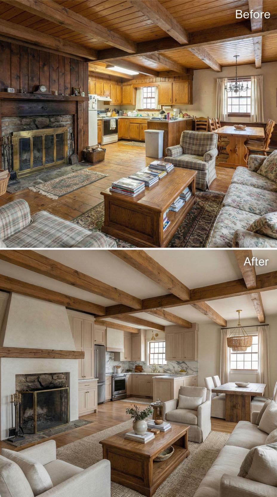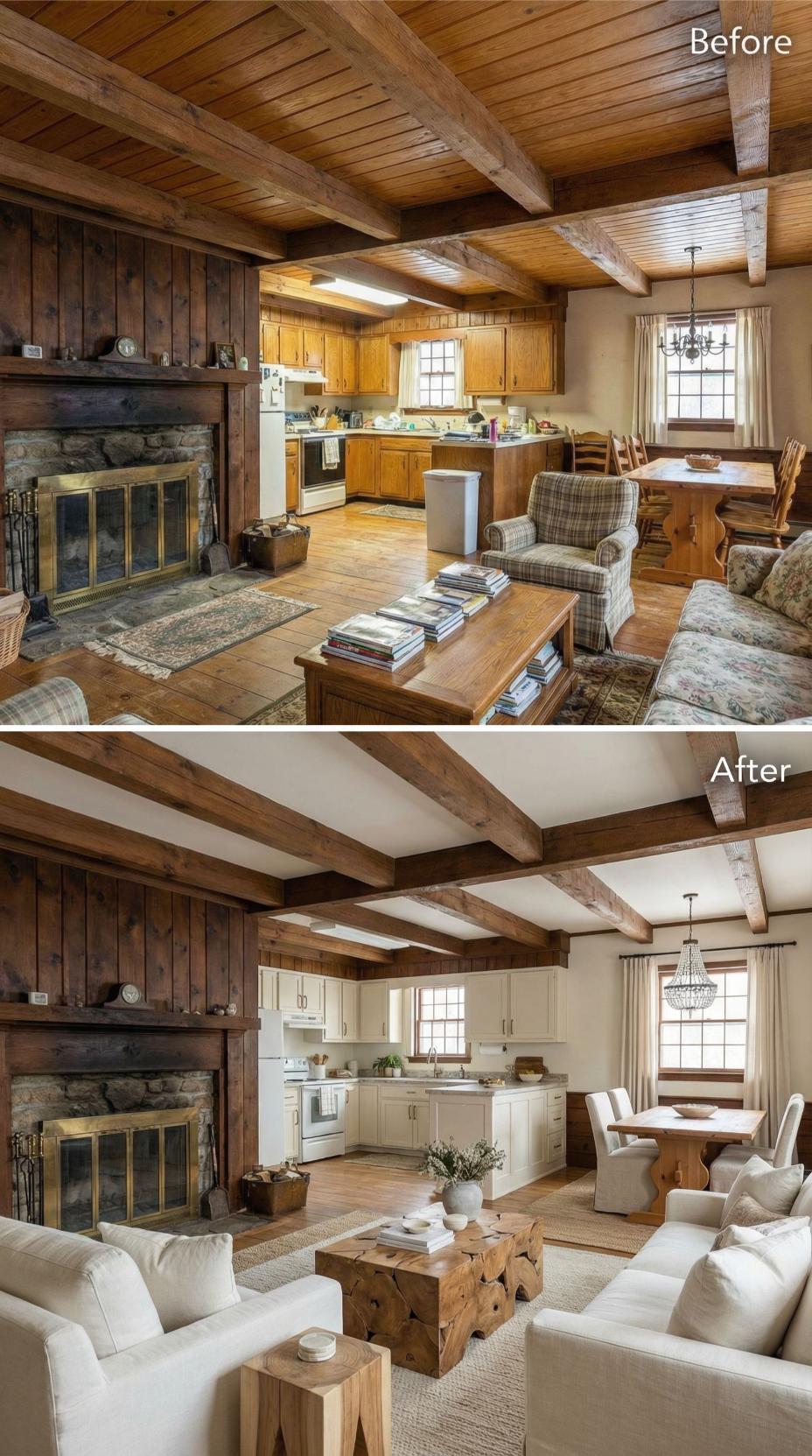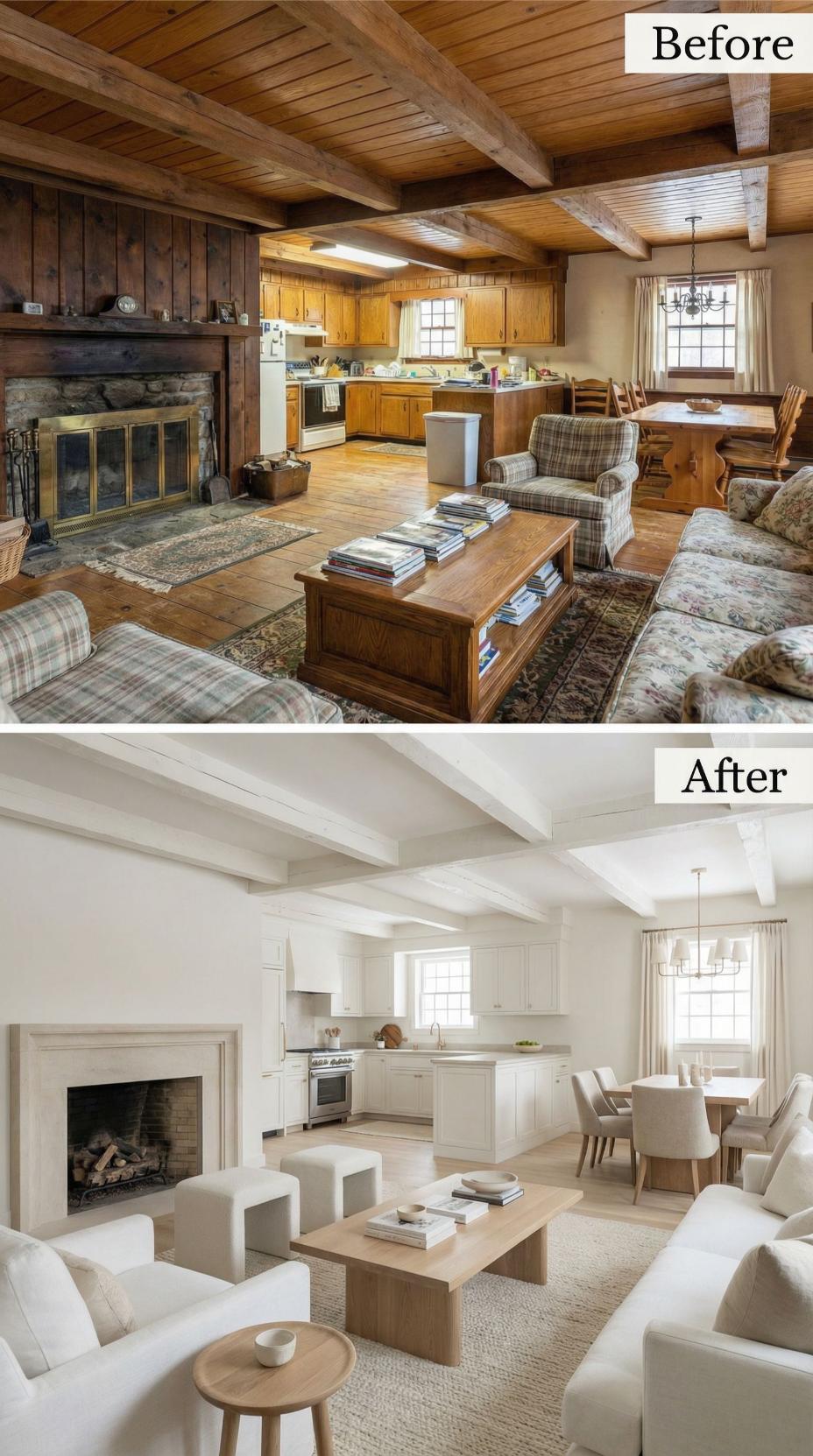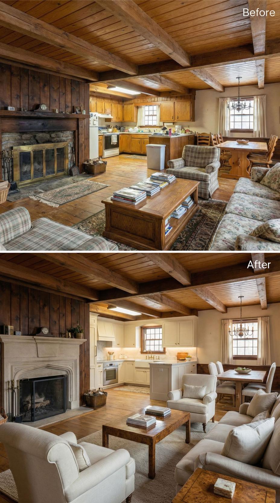 Heavy plaid furnishings and golden oak cabinetry gave way to crisp white kitchen cabinets and sophisticated neutral seating in this stunning cottage makeover. Light-colored upholstery and streamlined dining chairs replace the dated rustic cottage great roomโs busy patterns, while the preserved exposed beams maintain authentic character. Strategic styling with curated accessories and improved lighting creates an airy, refined atmosphere that feels both timeless and fresh.
