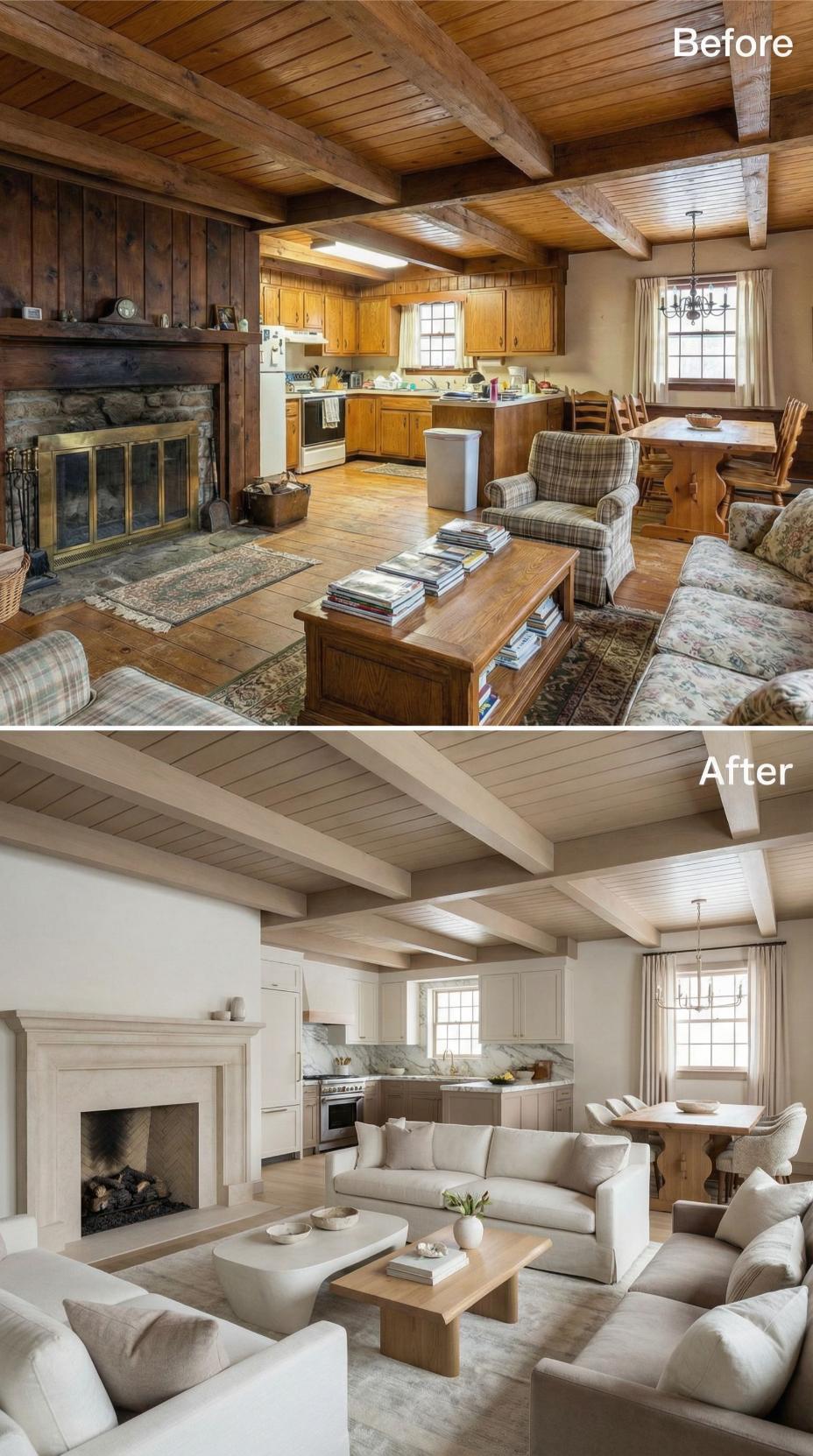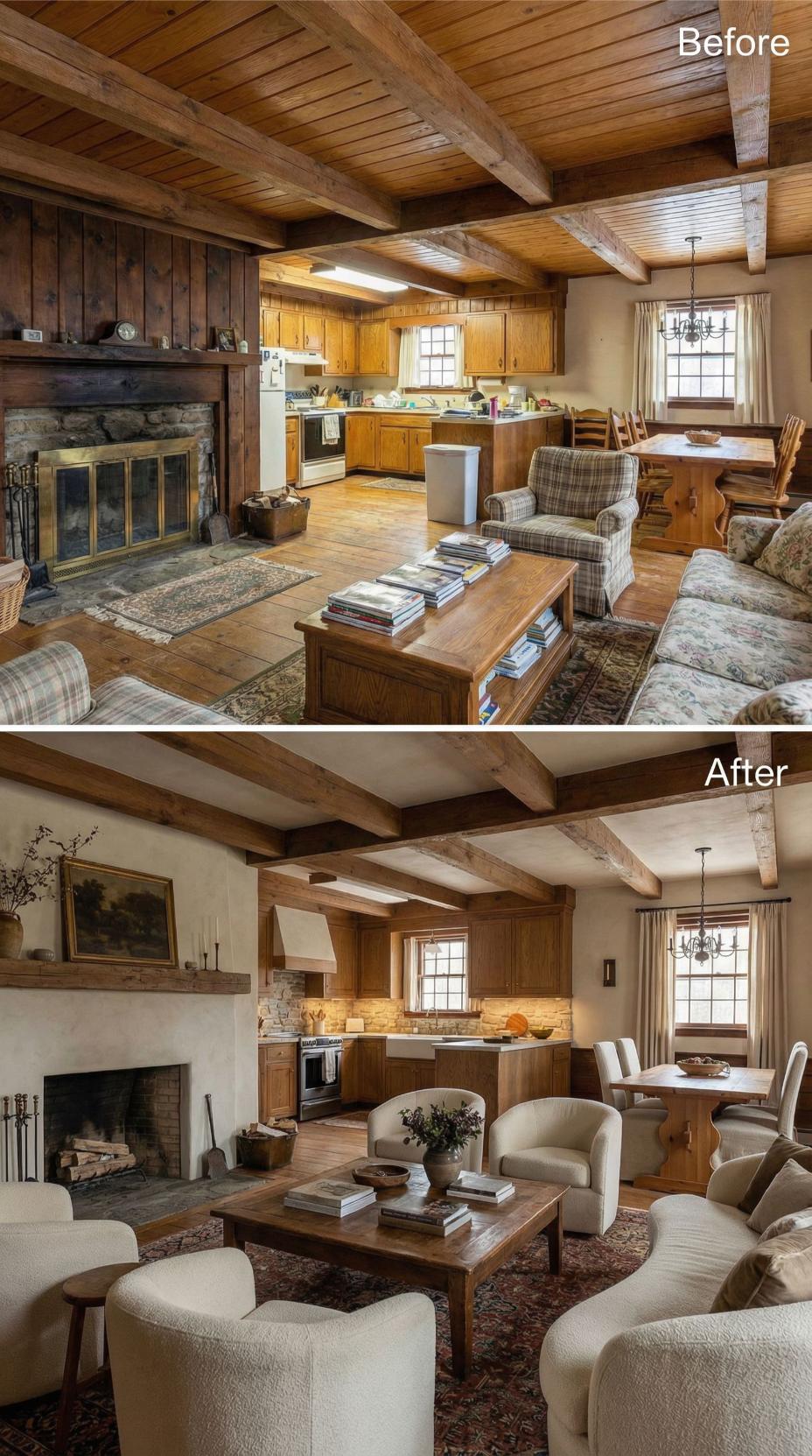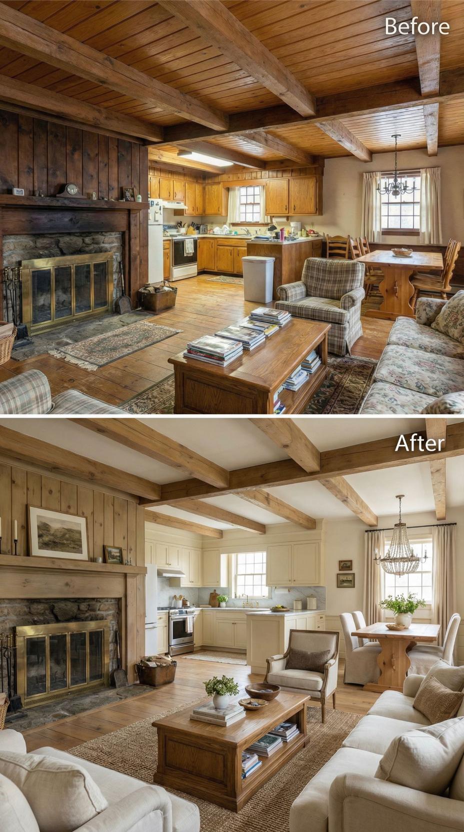 Heavy plaid furnishings and golden oak cabinetry gave way to crisp white kitchen cabinets and sophisticated neutral seating in this stunning cottage makeover. Light-colored upholstery and streamlined dining chairs replace the dated rustic cottage great roomโs busy patterns, while the preserved exposed beams maintain authentic character. Strategic styling with curated accessories and improved lighting creates an airy, refined atmosphere that feels both timeless and fresh.