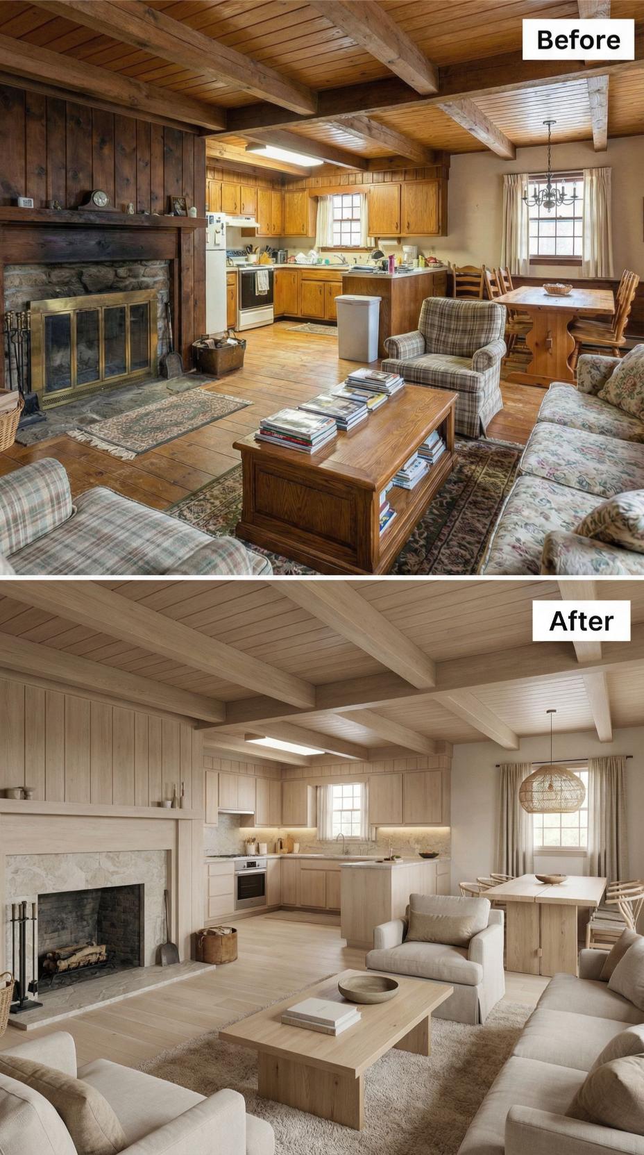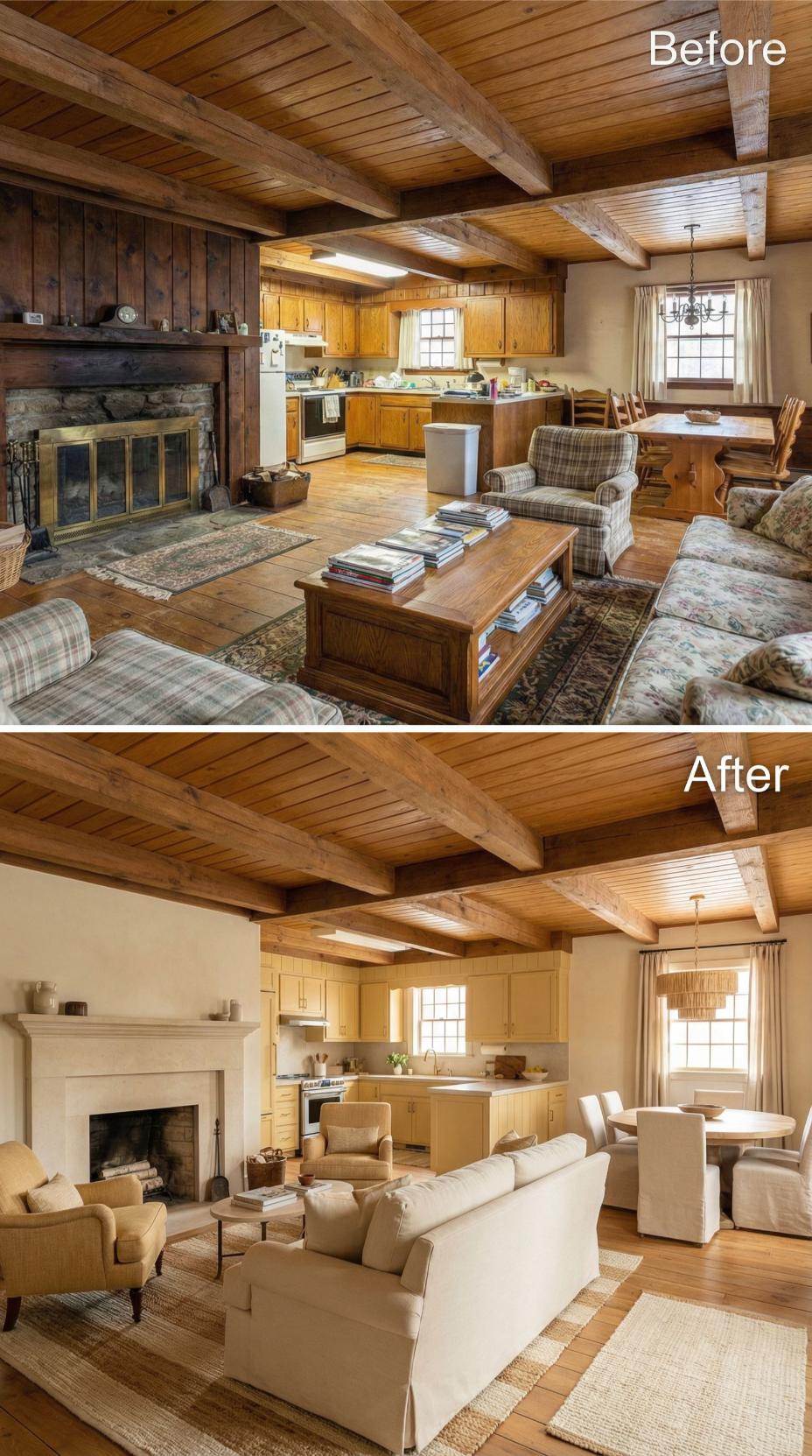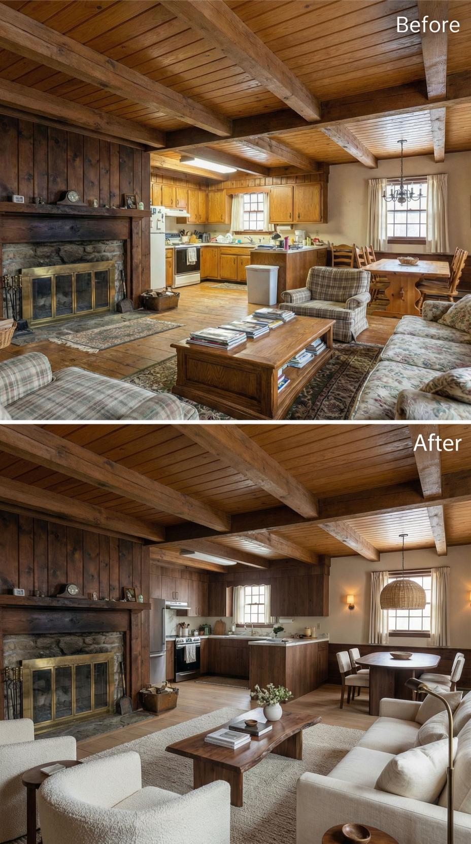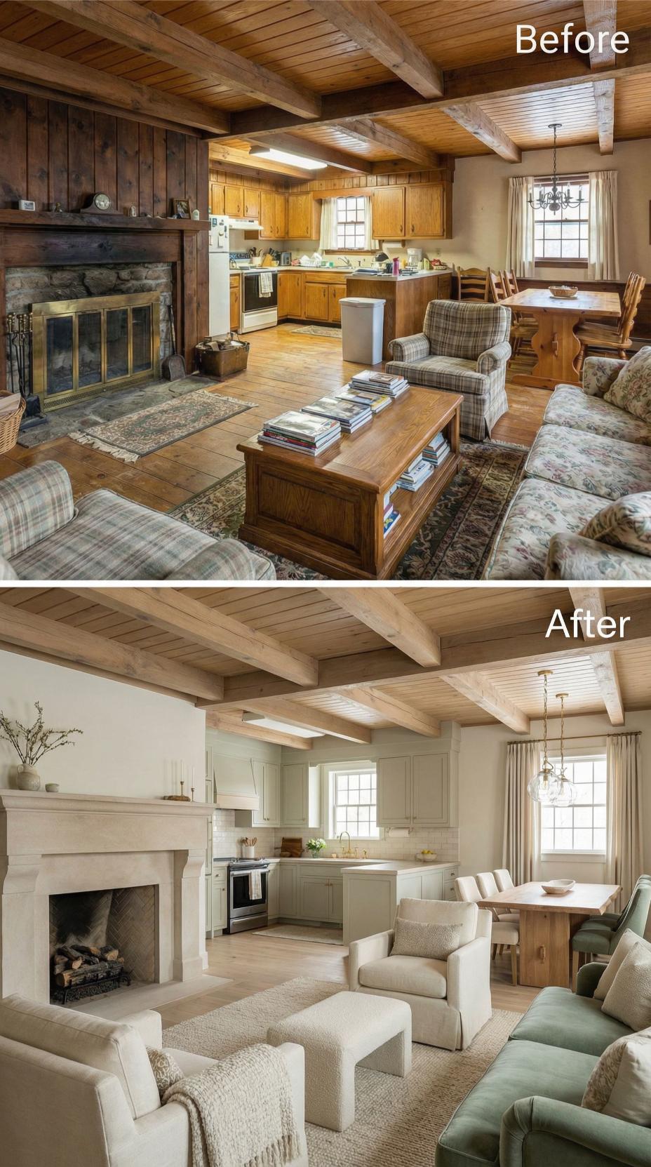 Heavy plaid furnishings and golden oak cabinetry gave way to crisp white kitchen cabinets and sophisticated neutral seating in this stunning cottage makeover. Light-colored upholstery and streamlined dining chairs replace the dated rustic cottage great roomโs busy patterns, while the preserved exposed beams maintain authentic character. Strategic styling with curated accessories and improved lighting creates an airy, refined atmosphere that feels both timeless and fresh.