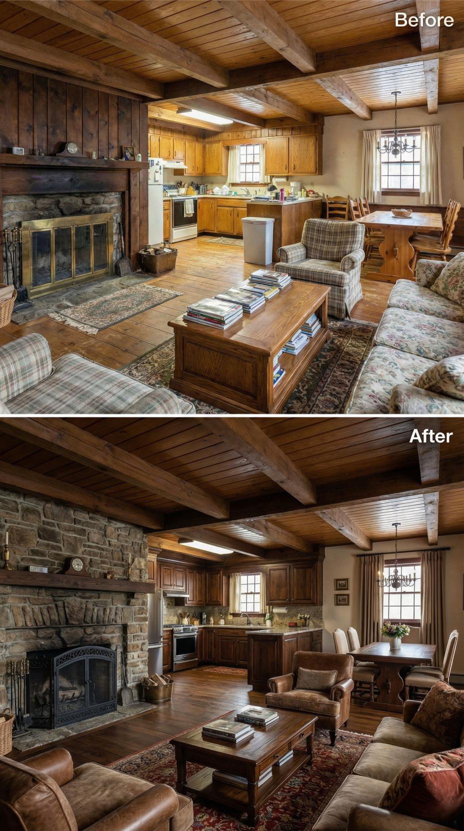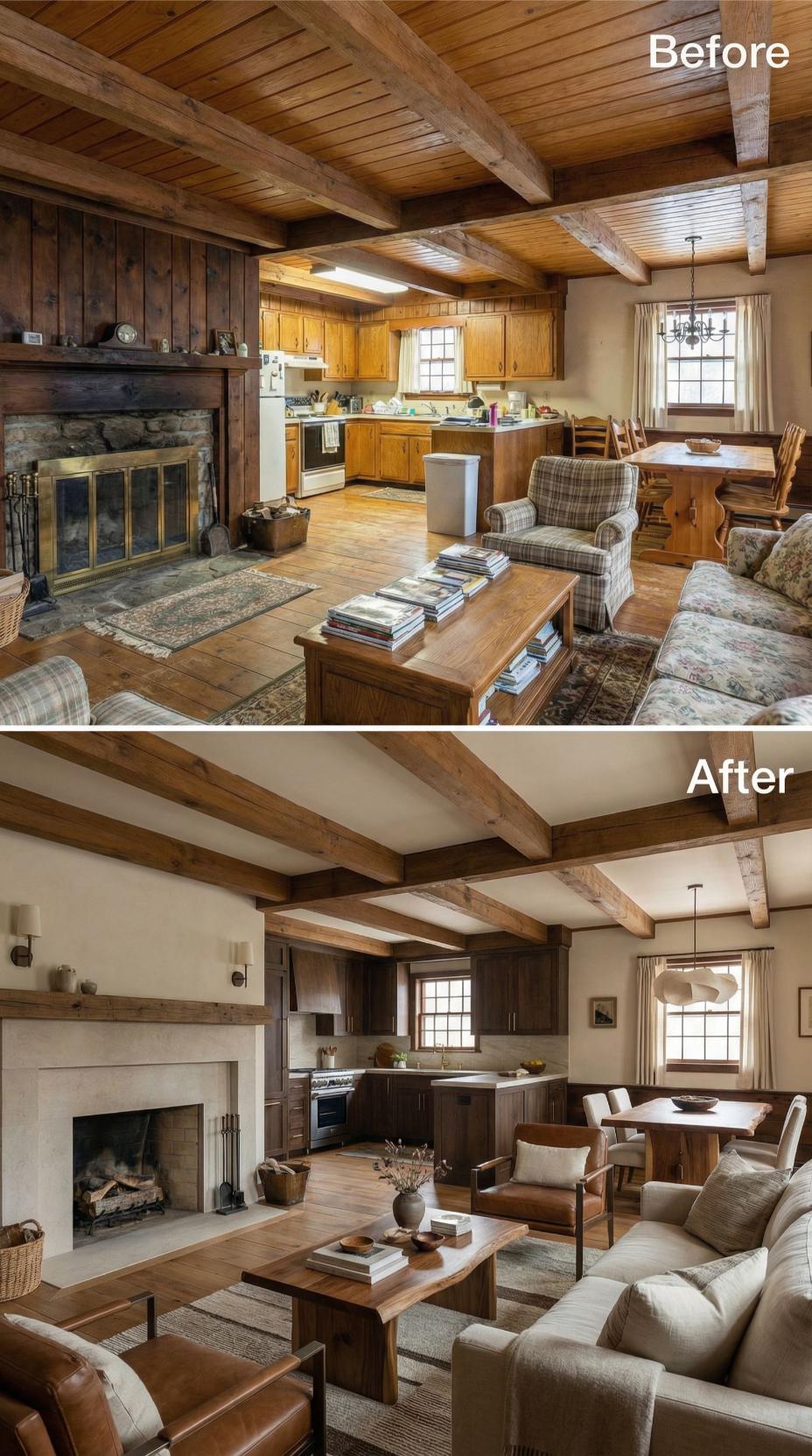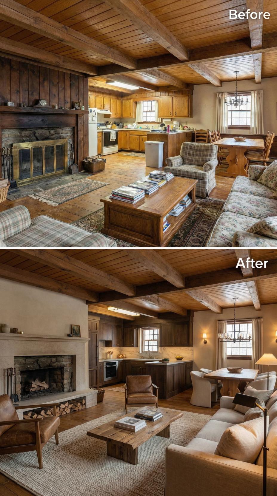 Dark wood paneling and heavy stone gave way to clean white walls and streamlined surfaces in this stunning transformation. The original exposed beams remain but now complement light-toned furnishings and a sleek marble backsplash. Modern gray sectional seating replaces busy patterns, while the fireplace received a contemporary limestone surround. Neutral tones throughout create an airy, sophisticated atmosphere that maintains the homeโs architectural character.