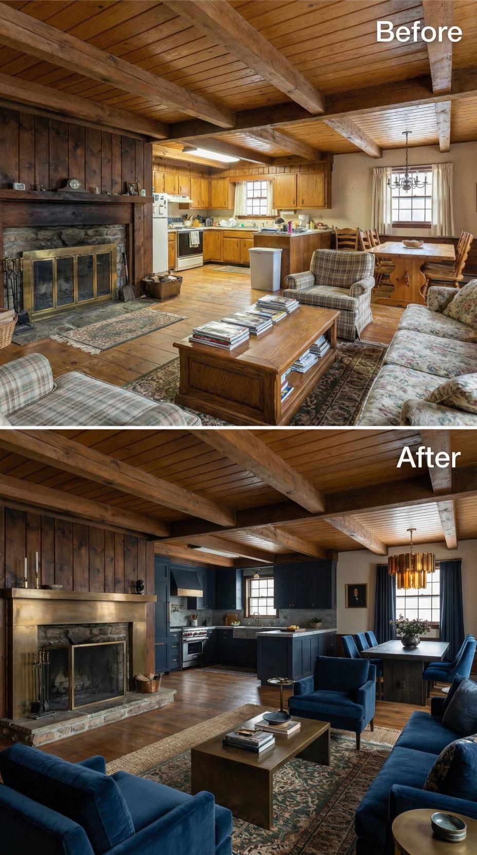 Bold navy cabinetry and upholstery completely reimagine this formerly dated rustic cottage great room into a sophisticated retreat. The transformation maintains original exposed ceiling beams and stone fireplace while introducing rich blue tones throughout the kitchen and seating area. Updated brass lighting fixtures and sleek navy dining chairs elevate the space from rustic to refined elegance.