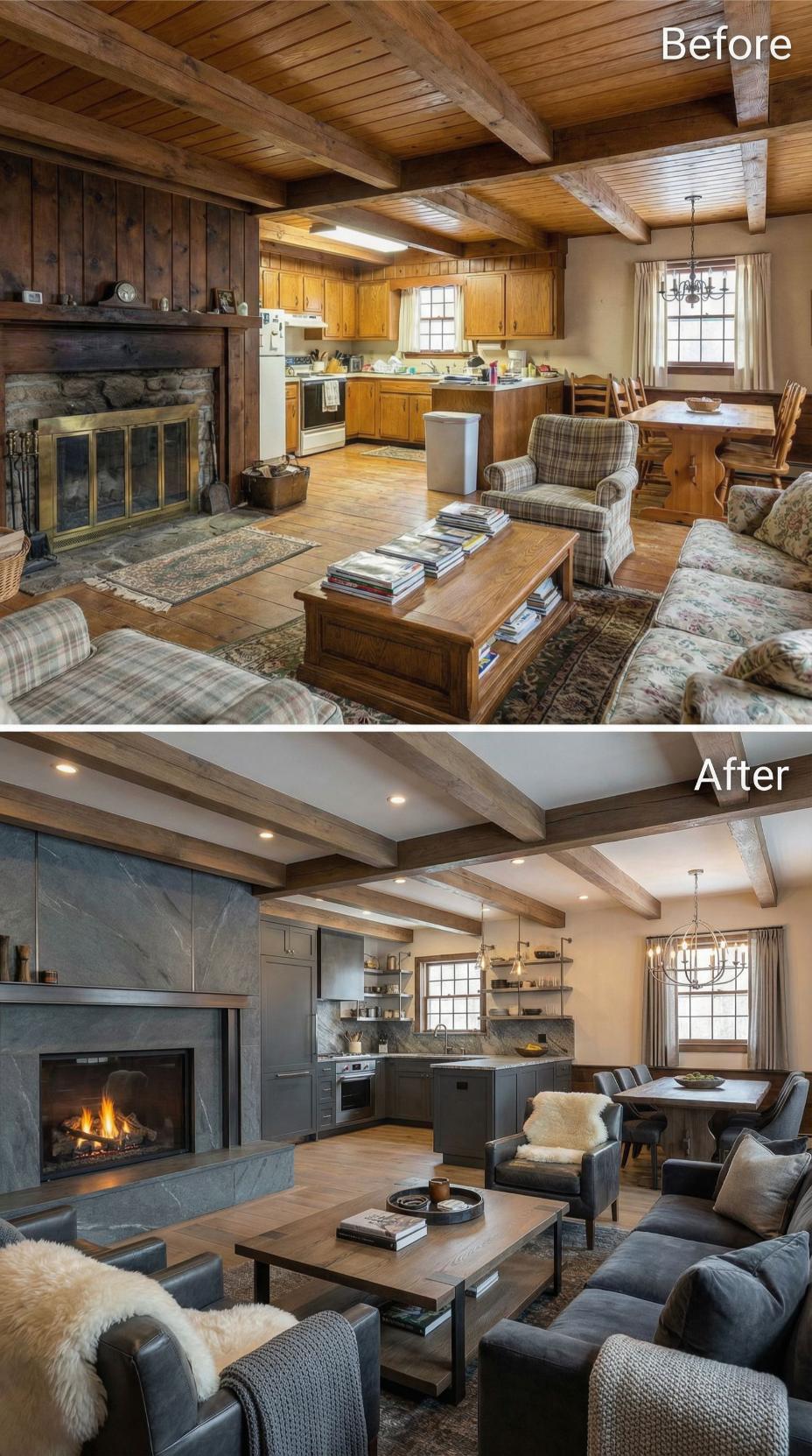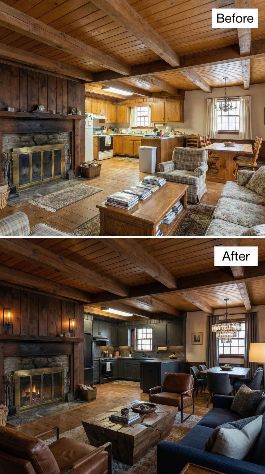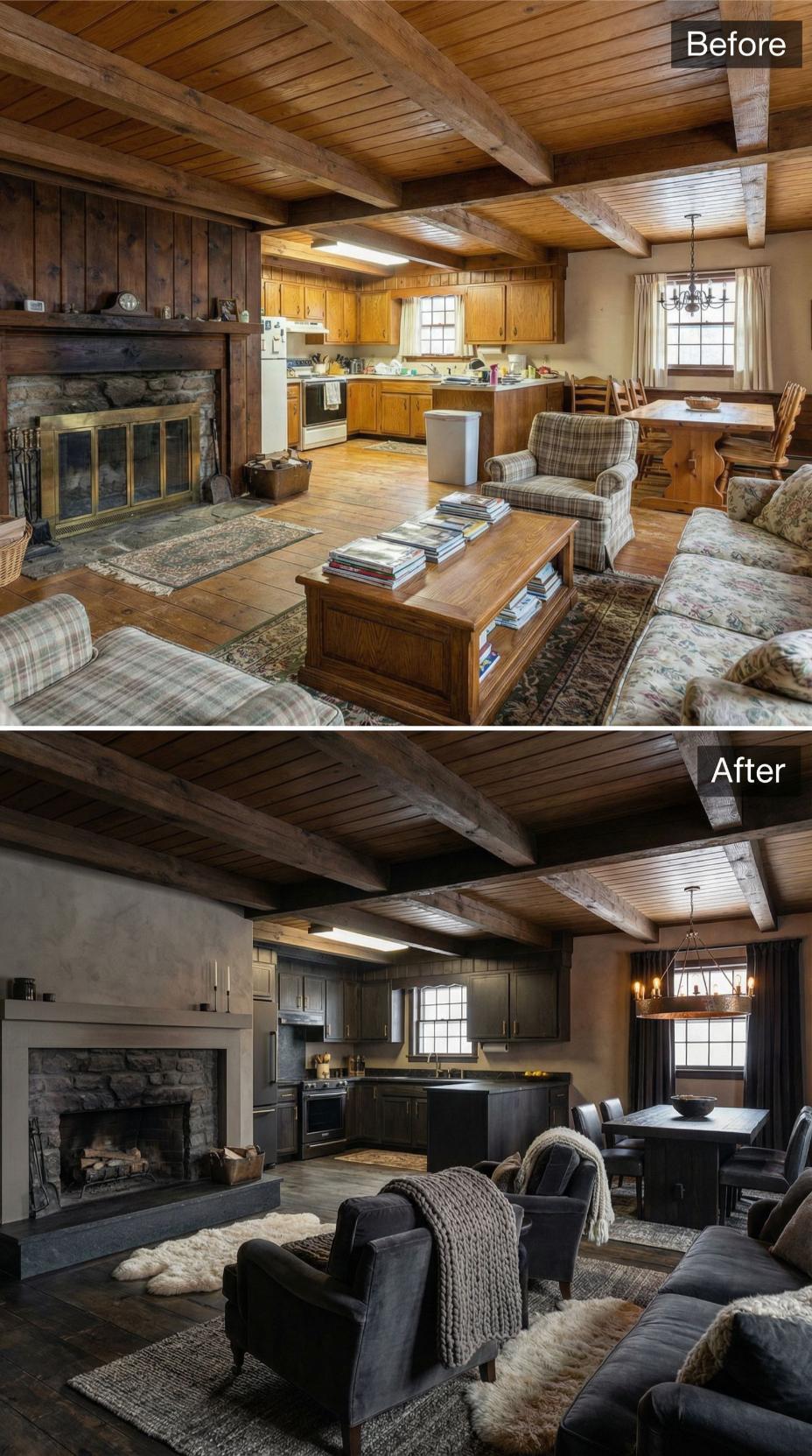Bold charcoal cabinetry and sleek stainless steel appliances replace the honey oak kitchen, creating sophisticated contrast against exposed ceiling beams. Modern gray sectional seating and a streamlined coffee table eliminate busy patterns, while dramatic slate fireplace surround updates the rustic stone. Industrial pendant lighting and flowing curtains complete the moody transformation.