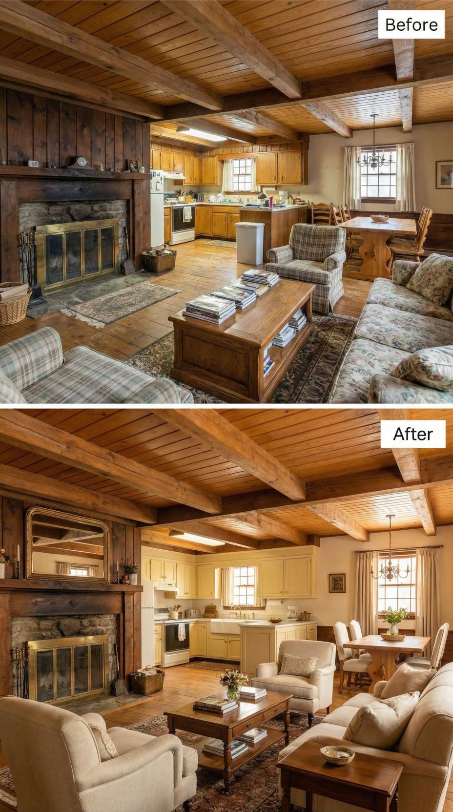 Bold neutral upholstery transforms this dated rustic cottage great room into sophisticated country elegance. Cream and beige furniture replaces busy plaid patterns while maintaining the cozy stone fireplace and honey-toned wood beams. Strategic styling with curated books and fresh greenery creates breathing room, proving that rustic charm thrives with refined simplicity and cohesive color schemes.