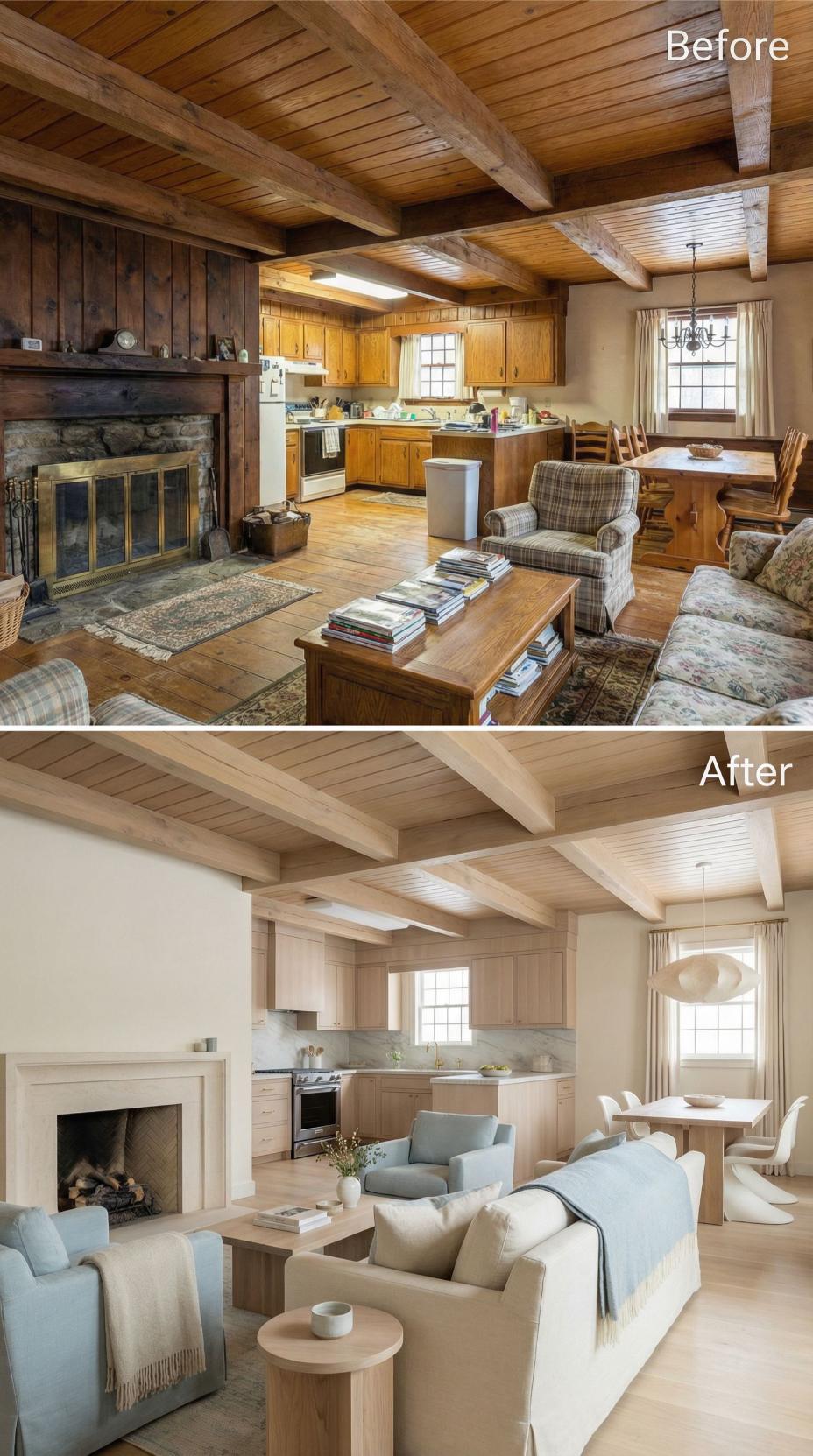 Whitewashed ceiling beams and light-toned hardwood floors instantly brighten this transformed space, replacing the heavy orange-toned wood that dominated before. Sleek white shaker cabinets with marble countertops create a fresh kitchen backdrop, while neutral linen upholstery and clean-lined furniture establish sophisticated comfort. The original stone fireplace remains but feels renewed within the cohesive cream and white palette.