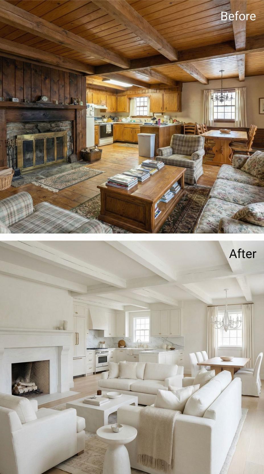 Dark wood paneling and heavy beams gave way to bright white walls and painted ceiling beams in this stunning cottage transformation. The dated rustic cottage great roomโs overwhelming brown palette disappeared under fresh white paint, while new cream upholstered seating replaced busy plaid furniture. Modern white kitchen cabinetry and a streamlined fireplace surround complete the airy, sophisticated makeover.