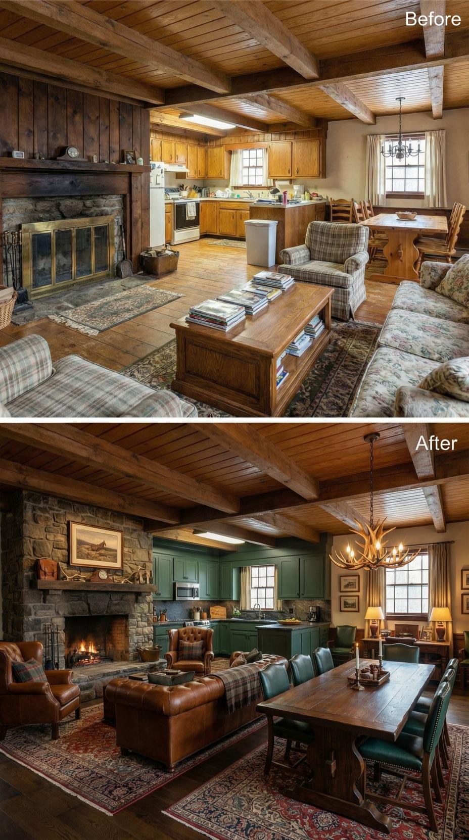 Bold forest green cabinetry replaces the honey oak kitchen, creating sophisticated contrast against the stone fireplace and warm wood beams. Rich leather seating and an antler chandelier elevate the rustic cottage charm, while emerald dining chairs echo the kitchenโs dramatic color palette. The transformation balances traditional cottage elements with refined, masculine touches throughout the open-concept space.