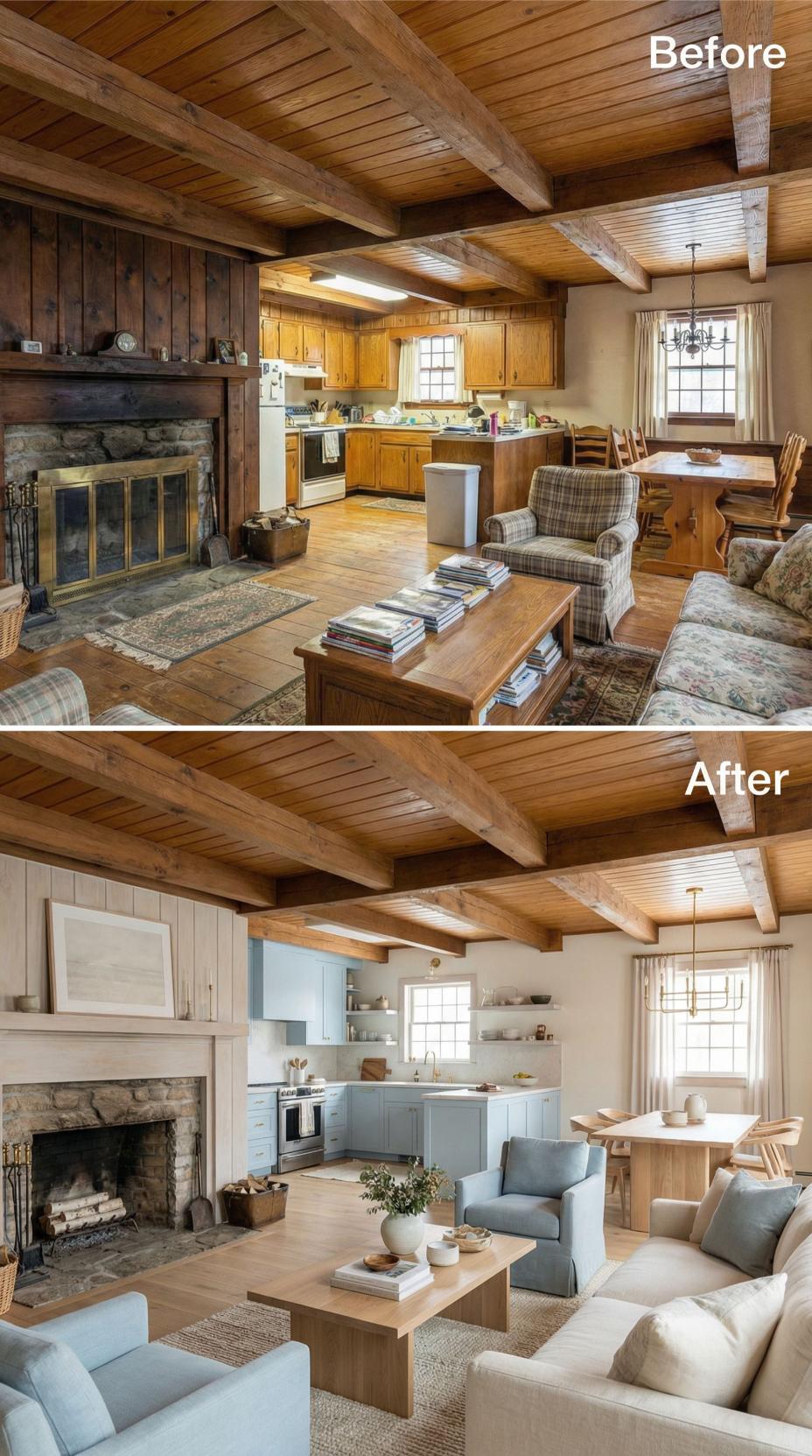 Clean lines and coastal colors breathe new life into this formerly dated rustic cottage great room. Light oak ceiling beams maintain architectural character while cream walls replace dark wood paneling. The stone fireplace receives a sleek white surround, and modern light blue upholstery creates a fresh focal point. Natural textures and minimalist furniture complete the Scandinavian-inspired transformation.
