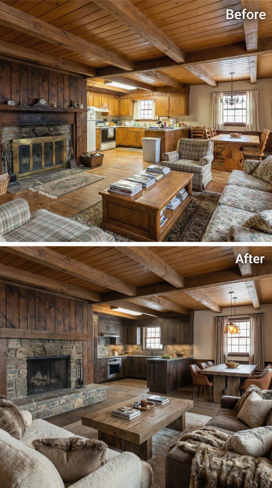 Rich walnut cabinetry and sophisticated stone backsplash elevate this dated rustic cottage great room into a refined mountain retreat. Luxurious faux fur throws and leather dining chairs replace worn plaid upholstery, while warm pendant lighting creates intimate ambiance. The transformation maintains rustic charm through exposed beams and stone fireplace while introducing elevated materials and cohesive earth-tone palette for sophisticated comfort.