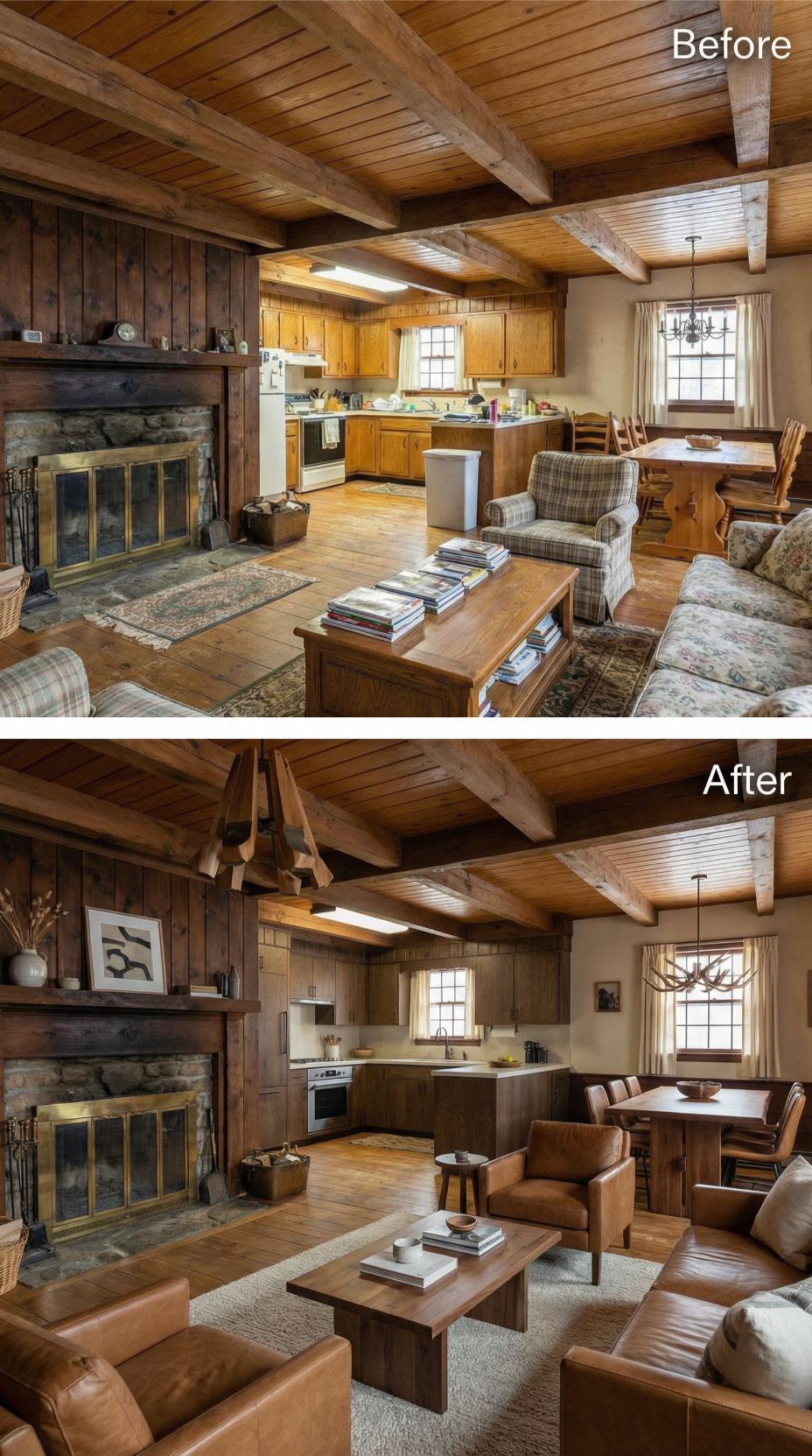 Elegant leather seating and refined stone fireplace surround replace the dated cottage furnishings, creating sophisticated gathering spaces. Rich walnut cabinetry and streamlined dining furniture elevate the kitchen area, while maintaining the roomโs authentic timber ceiling character. Warmer lighting and curated accessories complete the transformation from cluttered rustic cottage great room to polished family retreat.