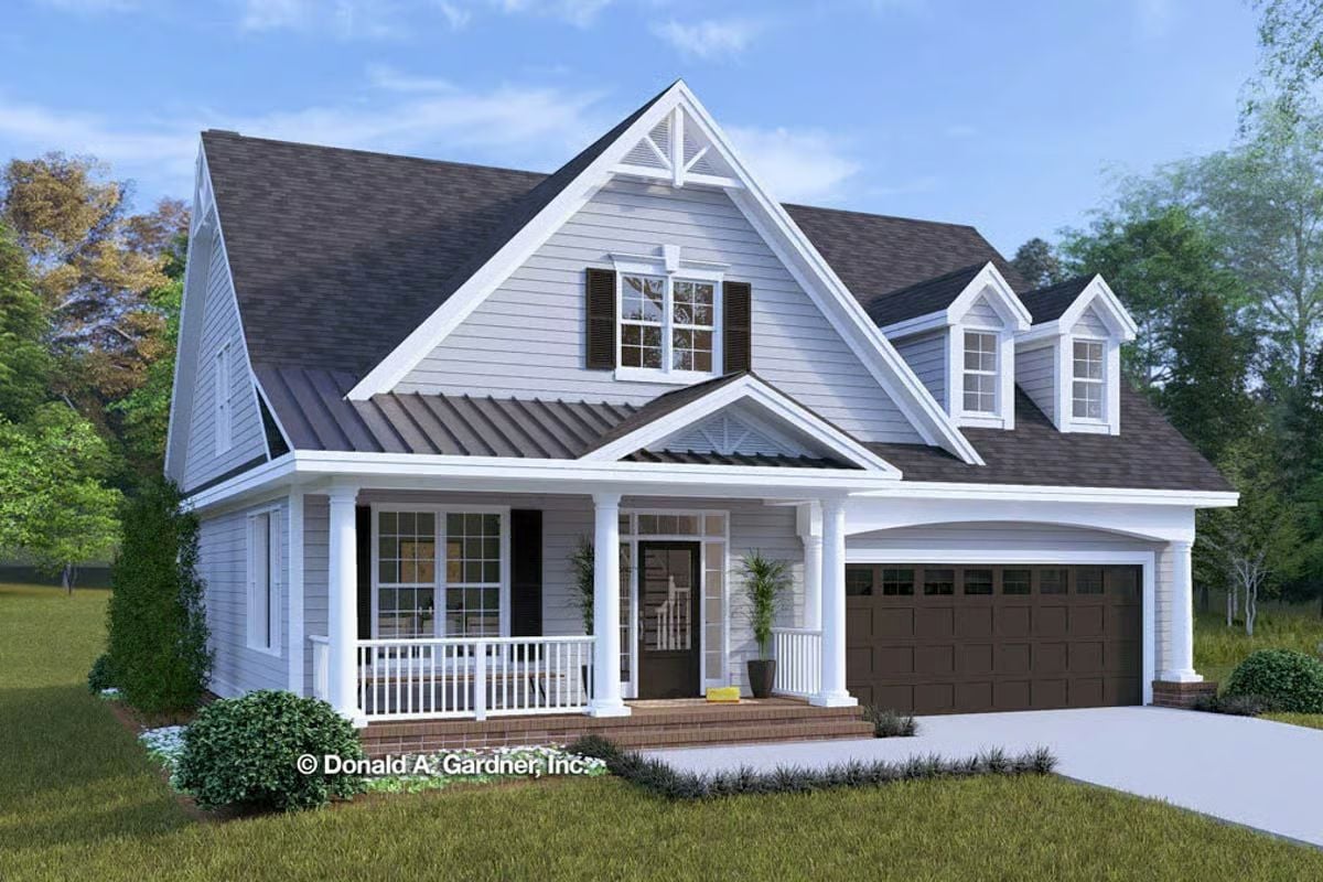 This home pairs classic cottage styling with a clean, well-proportioned exterior that feels welcoming and timeless. Gabled rooflines, dormer windows, and a covered front porch establish a traditional presence, while the attached garage is integrated in a way that keeps the faรงade balanced and residential in scale.
